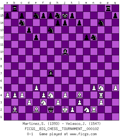 Last move : 0-1 2016 June 15 10:53:2 [Event "FICGS__BIG_CHESS__TOURNAMENT__000102"] [Site "FICGS"] [Date "2016.02.15"] [Round "1"] [White "Martinez,Silvio"] [Black "Velasco,Jose Maria"] [Result "0-1"] [WhiteElo "1393"] [BlackElo "1547"] 1.j2-k4 h15-g13 2.h1-o7 e15-e13 3.m2-m4 d15-d13 4.l1-p5 f16-e15 5.o7-o15 p16-o14 6.o15-l12 j15-k13 7.p1-o3 m15-m13 8.l12-l3 k16-h15 9.q2-q4 e15-b12 10.l3-l4 l16-o13 11.d2-d3 n15-n13 12.e2-e4 o16-b4 13.c2-c3 b4-f8 14.l2-l3 c16-k9 15.n2-n4 h16-o10 16.g2-g3 b16-c14 17.l4-b13 g16-e15 18.b13-b15 b12-a13 19.b15-b9 e13-e12 20.k4-l6 a16-b16 21.b9-g4 o13-p12 22.g4-f4 m13-m12 23.b2-b4 o10-c10 24.o1-l4 k13-l11 25.f1-e2 p12-o13 26.g1-f3 m16-m13 27.q4-q5 j16-j15 28.f4-p13 o13-q11 29.l4-k5 k9-m7 30.m4-m5 f8-g7 31.c1-b2 l15-l14 32.p13-p15 l11-n12 33.f3-h4 c10-f10 34.f2-f4 f10-o2 35.m1-m2 o2-g9 36.b1-d2 m13-j13 37.j3-j4 g7-h6 38.e1-g1 q11-n14 39.h4-f5 q16-p16 40.p15-l15 e16-l16 41.l15-n13 j13-n13 42.f5-h6 a13-h6 43.d2-f3 m7-p4 44.h2-g4 h6-g7 45.q1-q4 p4-o3 46.p2-o3 p16-p5 47.a1-b1 g9-n3 48.l6-m4 p5-p1 49.j1-j2 n13-p13 50.m2-n2 n3-q6 51.m4-o5 q6-o6 52.a2-a4 n14-j10 53.q4-o4 l16-p16 54.n4-n5 o6-o7 55.k1-m2 o7-m5 56.k5-l4 m5-m8 57.e4-e5 p1-g1 58.b1-g1 p13-p1 59.c3-c4 p1-g1 60.f3-g1 m8-g3 61.g1-f3 g3-g2 0-1 Follow this game move after move (download)Chess is played with the mind and not with the hands ! (Renaud and Kahn) Ohne Leiden bildet sich kein Charakter. (Ernst Freiherr von Feuchtersleben) El Ajedrez hace al hombre ser mas sabio y ver mas claro. (Vladimir Putin) Aux échecs, les retours au sommet sont rares : les dommages psychologiques consécutifs à une défaite sont trop sévères. (Daily Telegraph) The existence of forgetting has never been proved: We only know that some things don't come to mind when we want them. (Friedrich Nietzsche)