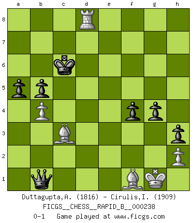 Last move : 0-1 2016 September 1 9:21:57 [Event "FICGS__CHESS__RAPID_B__000238"] [Site "FICGS"] [Date "2016.02.15"] [Round "1"] [White "Duttagupta,Aniruddha"] [Black "Cirulis,Ilmars"] [Result "0-1"] [WhiteElo "1816"] [BlackElo "1909"] 1.b3 a6 2.Bb2 d5 3.Nf3 c5 4.e3 Nc6 5.d4 Nf6 6.Nbd2 cxd4 7.Nxd4 Nxd4 8.Bxd4 Qc7 9.c4 e5 10.Bb2 Bf5 11.cxd5 Rd8 12.a3 Rxd5 13.Rc1 Qd8 14.b4 b5 15.f3 Be7 16.e4 Nxe4 17.fxe4 Bxe4 18.Nxe4 Rxd1+ 19.Rxd1 Qb6 20.Nc3 O-O 21.Nd5 Qe6 22.Nxe7+ Qxe7 23.Be2 Qh4+ 24.g3 Qe4 25.Rf1 Rc8 26.Kf2 g5 27.Rc1 Rc2 28.Rxc2 Qxc2 29.Bc1 g4 30.Rd1 h5 31.Be3 f5 32.Rd8+ Kg7 33.Rd3 h4 34.Rd7+ Kf6 35.Rd6+ Kf7 36.Rd1 Qe4 37.Bc5 h3 38.Rg1 Qc2 39.Be3 Qc3 40.Bc5 Qb2 41.Re1 f4 42.Kg1 Kf6 43.Bf1 Qc3 44.Bf2 Qxa3 45.gxf4 exf4 46.Bh4+ Kf5 47.Re8 Qb3 48.Rf8+ Ke5 49.Be1 Kd5 50.Rf5+ Kc6 51.Rc5+ Kb6 52.Re5 Kc7 53.Rc5+ Kb7 54.Re5 Qd1 55.Re7+ Kc6 56.Re6+ Kd5 57.Re8 Qd4+ 58.Kh1 Qa1 59.Kg1 a5 60.Rd8+ Kc6 61.Bc3 Qb1 0-1 This chess game has been lost on time (started : 2016.02.15 9:4:18) Nimzovich-Larsen attack Kingside Castling by player Black (move 20) Player Black won this chess game. Follow this game move after move (download)Spassky will not be psyched out by Fischer. (Mike Goodall) Ich war schon mal beim Dopingtest. Da musste ich Urin abgeben, während Dritte zusahen. (Elisabeth Pähtz) Un Peón pasado es un criminal, quién debe ser mantenido bajo candado y llave. Leves medidas, tales como vigilancia policiaca, no son suficientes. (Aaron Nimzovich) Nous sommes les pions de la mystérieuse partie d'Echecs jouée par Dieu. Il nous déplace, nous arrête, nous pousse encore, puis nous lance un à un dans la boîte du Néant. Epitaphe sur la tombe de David Janowsky (1868-1927). They misunderestimated me. (George W. Bush, Bentonville nov. 6, 2000)