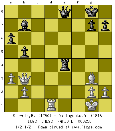 Last move : 1/2-1/2 2016 April 4 16:59:42 [Event "FICGS__CHESS__RAPID_B__000238"] [Site "FICGS"] [Date "2016.02.15"] [Round "1"] [White "Sternik,Ryszard"] [Black "Duttagupta,Aniruddha"] [Result "1/2-1/2"] [WhiteElo "1760"] [BlackElo "1816"] 1.d4 d5 2.c4 c6 3.Nf3 Nf6 4.Nc3 e6 5.e3 Nbd7 6.Bd3 dxc4 7.Bxc4 b5 8.Bd3 Bb7 9.O-O a6 10.e4 c5 11.d5 c4 12.Bc2 Qc7 13.dxe6 fxe6 14.Qe2 Bd6 15.Nd4 Nc5 16.f4 e5 17.Nf5 O-O 18.Rd1 Nd3 19.Nxd6 Qxd6 20.Bxd3 cxd3 21.Rxd3 Qc7 22.Rf3 Rae8 23.a3 exf4 24.Bxf4 Qc6 25.Bg3 Nxe4 26.Rxf8+ Kxf8 27.Nxe4 Rxe4 28.Qf3+ Kg8 29.Rd1 Qe8 30.Qb3+ 1/2-1/2 QGD Slav : 4.Nc3 Kingside Castling by player White (move 9) Kingside Castling by player Black (move 17) This chess game ended in a draw. Follow this game move after move (download)What would Chess be without silly mistakes ? (Kurt Richter) Die meiste Zeit treffe ich auf Gegner, die meine Enkel sein könnten. Ich bin da, um ihnen zu zeigen, dass sie von mir noch einiges lernen können. (Viktor Kortschnoi) Cuando tu no sabes absolutamente que mas hacer, es tiempo de entrar en pánico. (John van der Wiel) Il vaut mieux sacrifier les pièces de l'adversaire. (Xavier Tartacover) Do not put your faith in what statistics say until you have carefully considered what they do not say. (William W. Watt)