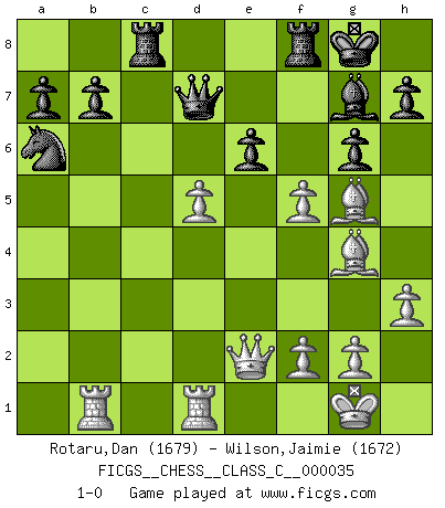 Last move : 1-0 2007 July 4 3:44:31 [Event "FICGS__CHESS__CLASS_C__000035"] [Site "FICGS"] [Date "2007.03.21"] [Round "1"] [White "Rotaru,Dan"] [Black "Wilson,Jaimie"] [Result "1-0"] [WhiteElo "1679"] [BlackElo "1672"] 1.d4 Nf6 2.c4 g6 3.Nc3 d5 4.cxd5 Nxd5 5.e4 Nxc3 6.bxc3 Bg7 7.Nf3 c5 8.Rb1 O-O 9.Be2 cxd4 10.cxd4 Qa5+ 11.Bd2 Qxa2 12.O-O Bg4 13.Bg5 Qe6 14.h3 Bxf3 15.Bxf3 Qd7 16.d5 Na6 17.Qe2 Rac8 18.Bg4 e6 19.Rfd1 f5 20.exf5 1-0 This chess game has been lost on time (started : 2007.03.21 2:13:31) King's Indian defense, 3.Nc3 Kingside Castling by player Black (move 8) Kingside Castling by player White (move 12) Player White won this chess game. Follow this game move after move (download)A big shock; the best chess player in history has passed away. (Lajos Portisch, about Bobby Fischer's death) Aljechin war kein Nazi. Er war ein Opportunist. Ein schrecklicher Mann. Er liebte Geld über alles und würde für Geld ein Jude, ein Katolik oder ein Protestant werden. (Miguel Najdorf) No hay un Gran Maestro de Ajedrez que sea normal; solo se diferencían ellos por la magnitud de su locura. (Viktor Korchnoi) Karpov est une pièce de musée. (Garry Kasparov) There's no money in correspondence chess. (John Knudsen)