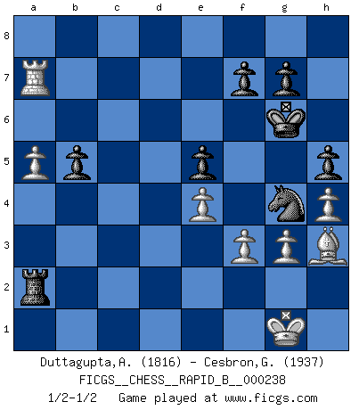 Last move : 1/2-1/2 2016 June 14 0:6:50 [Event "FICGS__CHESS__RAPID_B__000238"] [Site "FICGS"] [Date "2016.02.15"] [Round "1"] [White "Duttagupta,Aniruddha"] [Black "Cesbron,Guy"] [Result "1/2-1/2"] [WhiteElo "1816"] [BlackElo "1937"] 1.c4 Nf6 2.g3 c6 3.Bg2 d5 4.Nf3 dxc4 5.O-O Nbd7 6.Na3 Nb6 7.Qc2 Qd5 8.Ne1 Qd4 9.e3 Qg4 10.e4 e5 11.Nxc4 Nxc4 12.Qxc4 Bd6 13.b3 Be6 14.Qc2 h5 15.h4 Qg6 16.Bb2 O-O 17.d3 Rfe8 18.Nf3 Bg4 19.Nd2 Bc7 20.a4 Rad8 21.Nc4 b5 22.Ne3 Bb6 23.Nxg4 Nxg4 24.a5 Bd4 25.Bxd4 Rxd4 26.Rfd1 Red8 27.Bh3 Qd6 28.Rac1 Rxd3 29.Rxd3 Qxd3 30.Qxd3 Rxd3 31.Rxc6 Rxb3 32.Rc8+ Kh7 33.Ra8 Rb1+ 34.Kg2 Ra1 35.Rxa7 Kg6 36.f3 Ra2+ 37.Kg1 1/2-1/2 English, 1...Nf6 (Anglo-Indian defense) Kingside Castling by player White (move 5) Kingside Castling by player Black (move 16) This chess game ended in a draw. Follow this game move after move (download)Life is a kind of Chess, with struggle, competition, good and ill events. (Benjamin Franklin) Fischer machte Schach einfach zu einer aufregenden Sache, wann immer er sich ans Brett setzte. (Raymond Keene) Todo se encuentra en un estado de flujo y esto incluye al mundo del Ajedrez. (Mikhail Botvinnik) Plusieurs personnes se sont demandées comment Tal faisait pour gagner... En fait, c'est très simple ! Il met ses pièces au centre de l'échiquier et les sacrifie quelque part ! (David Bronstein) Chess, like love, like music, has the power to make people happy. (Siegbert Tarrasch)