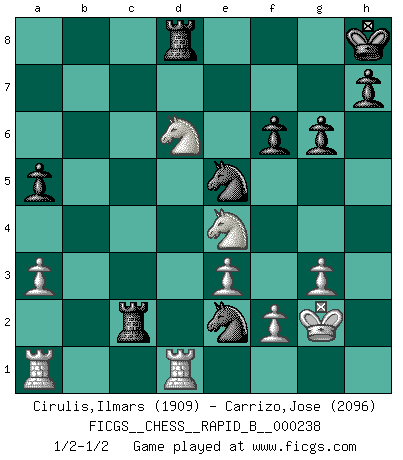 Last move : 1/2-1/2 2016 May 27 21:26:30 [Event "FICGS__CHESS__RAPID_B__000238"] [Site "FICGS"] [Date "2016.02.15"] [Round "1"] [White "Cirulis,Ilmars"] [Black "Carrizo,Jose"] [Result "1/2-1/2"] [WhiteElo "1909"] [BlackElo "2096"] 1.b4 e5 2.a3 d5 3.e3 Nf6 4.Bb2 Bd6 5.c4 c6 6.Nf3 Qe7 7.d4 Nbd7 8.cxd5 Nxd5 9.dxe5 Nxe5 10.Be2 a5 11.Qd4 f6 12.b5 O-O 13.Nbd2 Bf5 14.O-O Rfd8 15.bxc6 bxc6 16.Qa4 Nd3 17.Bd4 c5 18.Qc4 cxd4 19.Nxd4 Bxh2+ 20.Kxh2 Rac8 21.Qa2 Qc7+ 22.g3 Kh8 23.Nxf5 Nc3 24.Qe6 Nxe2 25.Ne4 Qe5 26.Qxe5 Nxe5 27.Kg2 g6 28.Nfd6 Rc2 29.Rfd1 1/2-1/2 Polish (Sokolsky) opening Kingside Castling by player Black (move 12) Kingside Castling by player White (move 14) This chess game ended in a draw. Follow this game move after move (download)My style is somewhere between that of Tal and Petrosian. (Reshevsky) Charakterschwächen offenbaren sich normalerweise während einer Schachpartie. (Garry Kasparov) Me siento como si fuera una pieza en una partida de Ajedrez, cuando mi oponente me indica: esa pieza no puede ser movida. (Soren Kierkegaard) Fischer est le meilleur joueur du monde et Karpov n'est qu'un joueur de bistrot. (Garry Kasparov, agé de 16 ans) The Internet isn't free. It just has an economy that makes no sense to capitalism. (Brad Shapcott)