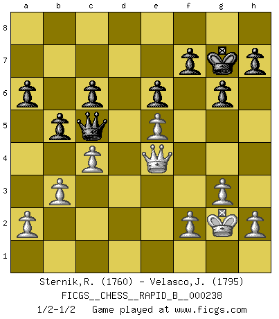 Last move : 1/2-1/2 2016 March 5 19:26:3 [Event "FICGS__CHESS__RAPID_B__000238"] [Site "FICGS"] [Date "2016.02.15"] [Round "1"] [White "Sternik,Ryszard"] [Black "Velasco,Jose Maria"] [Result "1/2-1/2"] [WhiteElo "1760"] [BlackElo "1795"] 1.Nf3 Nf6 2.c4 c5 3.Nc3 e6 4.g3 b6 5.Bg2 Bb7 6.O-O Be7 7.d4 cxd4 8.Nxd4 Bxg2 9.Kxg2 O-O 10.e4 Qc7 11.Qd3 a6 12.Rd1 Nc6 13.Nxc6 dxc6 14.Qe2 Nd7 15.Be3 Rfd8 16.Rd2 b5 17.Rad1 Nc5 18.Bxc5 Bxc5 19.e5 Rxd2 20.Rxd2 Rd8 21.Rxd8+ Qxd8 22.Ne4 Qd4 23.Nxc5 Qxc5 24.b3 g6 25.Qe4 Kg7 1/2-1/2 Reti Opening Kingside Castling by player White (move 6) Kingside Castling by player Black (move 9) This chess game ended in a draw. Follow this game move after move (download)Chess is ruthless: you've got to be prepared to kill people. (Nigel Short) Habe Mut, dich deines eigenen Verstandes zu bedienen. (Immanuel Kant) Alekhine es un poeta que crea un trabajo de arte de algo que raramente inspiraría a otra persona a mandar una tarjeta postal. (Max Euwe) Il s'avisa de me proposer d'apprendre les échecs qu'il jouait un peu... me voilà forcené des échecs. J'achète un échiquier, je m'enferme dans ma chambre, j'y passe des jours et des nuits à vouloir apprendre par cur toutes les parties. (Jean-Jacques Rousseau, Confessions) Programming can only do so much before it becomes too much. (Don Groves)