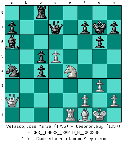 Last move : 1-0 2016 April 9 1:15:50 [Event "FICGS__CHESS__RAPID_B__000238"] [Site "FICGS"] [Date "2016.02.15"] [Round "1"] [White "Velasco,Jose Maria"] [Black "Cesbron,Guy"] [Result "1-0"] [WhiteElo "1795"] [BlackElo "1937"] 1.d4 Nf6 2.c4 e6 3.Nf3 b6 4.g3 Ba6 5.b3 Bb4+ 6.Bd2 Be7 7.Bg2 c6 8.Bc3 d5 9.Ne5 Nfd7 10.Nxd7 Nxd7 11.Nd2 O-O 12.O-O Rc8 13.e4 b5 14.Re1 dxc4 15.bxc4 bxc4 16.Qa4 Bb5 17.Qc2 Re8 18.a4 Ba6 19.Bf1 c5 20.d5 exd5 21.exd5 Nb6 22.Rad1 Bf8 23.Rxe8 Qxe8 24.Ne4 Nxa4 25.Ng5 g6 26.Re1 Qd7 27.Ne4 Bg7 28.Bxg7 Kxg7 29.Qa2 1-0 Queen's Indian : Nimzovich variation (exaggerated Fianchetto) Kingside Castling by player Black (move 11) Kingside Castling by player White (move 12) Player White won this chess game. Follow this game move after move (download)Help your pieces so they can help you. (Paul Morphy) Es ist wirklich schade, dass so viele Schachspieler nicht auf ihr Äußeres achten! (Alexandra Kosteniuk) ¿Quién es tu oponente esta tarde? Esta tarde mi oponente son las piezas negras. (Akiba Rubinstein) Aux échecs, les retours au sommet sont rares : les dommages psychologiques consécutifs à une défaite sont trop sévères. (Daily Telegraph) If computers get too powerful, we can organize them into committees. That'll do them in. (Anonymous)