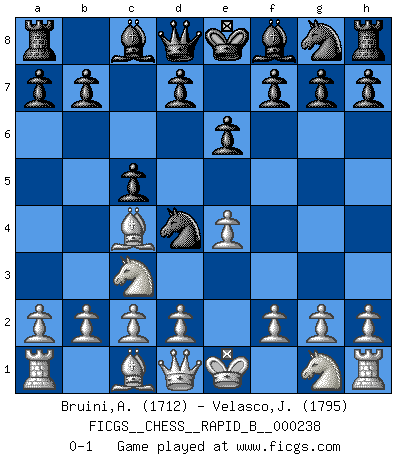 Last move : 0-1 2016 March 21 6:51:38 [Event "FICGS__CHESS__RAPID_B__000238"] [Site "FICGS"] [Date "2016.02.15"] [Round "1"] [White "Bruini,Andrea"] [Black "Velasco,Jose Maria"] [Result "0-1"] [WhiteElo "1712"] [BlackElo "1795"] 1.e4 c5 2.Nc3 Nc6 3.Bb5 Nd4 4.Bc4 e6 0-1 This chess game has been lost on time (started : 2016.02.15 9:4:18) Sicilian : Closed, 2...Nc6 Player Black won this chess game. Follow this game move after move (download)Capture of the adverse King is the ultimate but not the first object of the game. (William Steinitz) Die Auseinandersetzung mit Karpow war politisch geprägt. Er stand für das kommunistische System, wurde von dessen Repräsentanten gehätschelt. Ich war der Oppositionelle. Jeder Schachweltmeister spiegelt auch die gesellschaftlichen Verhältnisse wider. Kramnik steht für die Börsen-Generation des Neuen Markts, ideologiefrei, zahlenfixiert. (Garry Kasparov) No puedes jugar al Ajedrez si eres de corazón noble. (Proverbio Francés) Un journaliste : 'Vous préférez avoir une dame de plus sur l'échiquier ou au lit ?' Boris Spassky : 'Ca dépend de la position.' My poor ole parrot... Is not in the circulation of displays ....poo hoo hoo :) (Wayne Lowrance's enigma)