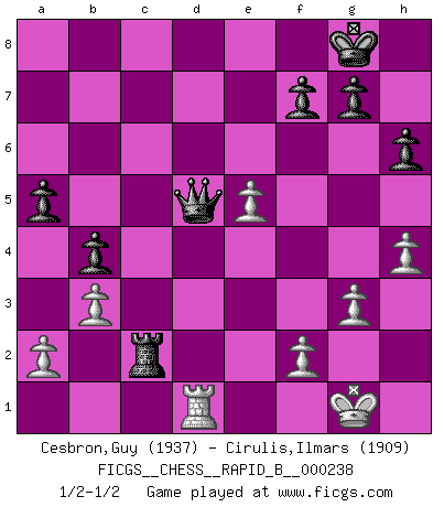 Last move : 1/2-1/2 2016 July 3 0:46:27 [Event "FICGS__CHESS__RAPID_B__000238"] [Site "FICGS"] [Date "2016.02.15"] [Round "1"] [White "Cesbron,Guy"] [Black "Cirulis,Ilmars"] [Result "1/2-1/2"] [WhiteElo "1937"] [BlackElo "1909"] 1.e4 a6 2.d4 e6 3.Nf3 d5 4.Nbd2 Nf6 5.Bd3 c5 6.e5 Nfd7 7.c3 Be7 8.O-O b6 9.Re1 a5 10.c4 Bb7 11.cxd5 Bxd5 12.Be4 Nc6 13.Bxd5 exd5 14.dxc5 Nxc5 15.Nb3 O-O 16.Nbd4 Rc8 17.Nxc6 Rxc6 18.Nd4 Rc7 19.Be3 Qd7 20.Rc1 Ne6 21.Qd3 Bc5 22.g3 Rfc8 23.Rcd1 Bxd4 24.Bxd4 b5 25.b3 Rc2 26.Rd2 Rxd2 27.Qxd2 b4 28.Rd1 h6 29.h4 Nxd4 30.Qxd4 Rc2 31.Qxd5 Qxd5 1/2-1/2 St. George (Baker) defense Kingside Castling by player White (move 8) Kingside Castling by player Black (move 15) This chess game ended in a draw. Follow this game move after move (download)I'm not afraid of Spassky. The world knows I'm the best. You don't need a match to prove it. (Bobby Fischer) Ich kämpfe solange mein Gegner einen Fehler machen kann. (Emanuel Lasker) Bobby Fischer es el jugador de Ajedrez mas grande que jamás haya existido. (Ken Smith) Il n'y a pas de prix trop élevé au scalp de l'ennemi. (Koblentz) I teach you to lie, cheat and steal, and as soon as my back's turned you wait in line ? (Gregory House, House M.D.)