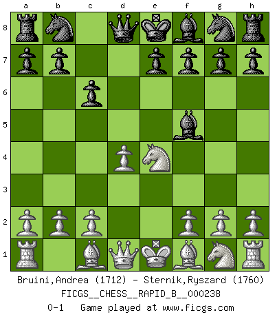 Last move : 0-1 2016 March 21 6:51:38 [Event "FICGS__CHESS__RAPID_B__000238"] [Site "FICGS"] [Date "2016.02.15"] [Round "1"] [White "Bruini,Andrea"] [Black "Sternik,Ryszard"] [Result "0-1"] [WhiteElo "1712"] [BlackElo "1760"] 1.e4 c6 2.d4 d5 3.Nc3 dxe4 4.Nxe4 Bf5 0-1 This chess game has been lost on time (started : 2016.02.15 9:4:18) Caro-Kann : Classical variation Player Black won this chess game. Follow this game move after move (download)The game of Chess is not merely an idle amusement; several very valuable qualities of the mind are to be acquired and strengthened by it, so as to become habits ready on all occasions; for life is a kind of Chess. (Benjamin Franklin) Obendrein hat der FIDE-Präsident den Revolutionsführer Gaddafi zum »Großmeister« ernannt, am Ende der WM. Das ist lächerlich! (Joel Lautier) El Jaque al descubierto es el bombardero del tablero. (Reuben Fine) Un footballeur joue avec ses pieds, parfois avec sa tête. Un joueur d'échecs ne joue qu'avec sa tête. Et quand il ne joue plus, il meurt. (Jacob Murray) First of all, we have to go back to the classical time control. (Anatoly Karpov)