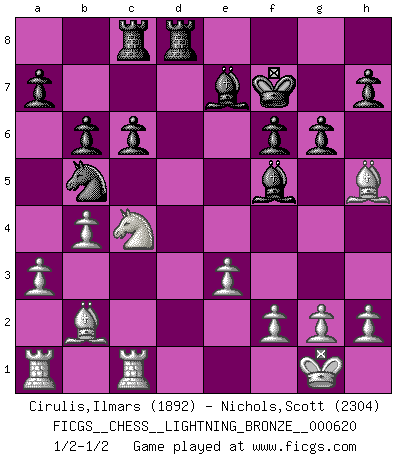 Last move : 1/2-1/2 2016 February 15 16:41:57 [Event "FICGS__CHESS__LIGHTNING_BRONZE__000620"] [Site "FICGS"] [Date "2016.02.15"] [Round "1"] [White "Cirulis,Ilmars"] [Black "Nichols,Scott"] [Result "1/2-1/2"] [WhiteElo "1892"] [BlackElo "2304"] 1.b4 e5 2.a3 d5 3.e3 Nf6 4.Bb2 Bd6 5.c4 c6 6.Nf3 Qe7 7.d4 Nbd7 8.cxd5 Nxd5 9.dxe5 Nxe5 10.Be2 O-O 11.Qd4 f6 12.Nbd2 Rd8 13.Qe4 Nxf3+ 14.Bxf3 Qxe4 15.Bxe4 Be7 16.Nc4 b6 17.O-O Be6 18.Rfc1 Rac8 19.Bf3 Kf7 20.Be2 Nc7 21.Bd4 Nb5 22.Bb2 Bf5 23.Bh5+ g6 1/2-1/2 Polish (Sokolsky) opening Kingside Castling by player Black (move 10) Kingside Castling by player White (move 17) This chess game ended in a draw. Follow this game move after move (download)Bobby just drops the pieces and they fall on the right squares. (Miguel Najdorf) Ich bewundere Kasparows phantasievolle Angriffssiege aus den Achtzigern und Neunzigern, aber wenn man sie mit dem Computer überprüft, nimmt der Computer in jeder zweiten Partie die Opfer an, verteidigt sich und gewinnt. (Vladimir Kramnik) Un entendimiento minucioso de las típicas continuaciones de mate hacen de las mas complicadas combinaciones de sacrificio que conducen hacia ellas no solo no dificiles, sino casi un asunto de rutina. (Siegbert Tarrasch) Les Echecs mettent en conflit, non pas deux intelligences, mais deux volontés. (Lasker) The difference between stupidity and genius is that genius has its limits. (Murphy)