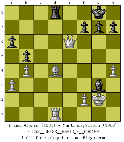Last move : 1-0 2016 July 6 4:31:41 [Event "FICGS__CHESS__RAPID_E__000169"] [Site "FICGS"] [Date "2016.02.15"] [Round "1"] [White "Bromo,Alexis"] [Black "Martinez,Silvio"] [Result "1-0"] [WhiteElo "1095"] [BlackElo "1088"] 1.d4 d5 2.c4 dxc4 3.Nc3 Nf6 4.e3 e6 5.a3 Nc6 6.Bxc4 Be7 7.Nf3 O-O 8.O-O e5 9.h3 exd4 10.Nxd4 Nxd4 11.exd4 Re8 12.Re1 a6 13.b4 b5 14.Bb3 Bb7 15.Be3 Bd6 16.d5 c6 17.Qf3 cxd5 18.Nxd5 Nxd5 19.Bxd5 Bxd5 20.Qxd5 Qf6 21.Bd4 Qf4 22.g3 Qh6 23.Kg2 Rad8 24.Rxe8+ Rxe8 25.Qc6 Qe6 26.h4 Rd8 27.Rd1 Bxg3 28.Qxe6 1-0 Queen's gambit accepted Kingside Castling by player Black (move 7) Kingside Castling by player White (move 8) Player White won this chess game. Follow this game move after move (download)Bobby Fischer's current state of mind is indeed a tragedy. One of the world's greatest Chess players - the pride and sorrow of American Chess. (Frank Brady) Ein Kibitz ist einer, der deinem Gegner gute Ratschläge gibt. (Andrew Soltis) Aquellos que dicen entender al Ajedrez, no entienden nada. (Robert Hubner) Si je n'étais pas joueur d'échecs, je serais le meilleur dans quelque chose d'autre. (Anatoli Karpov) When I took office, only high energy physicists had ever heard of what is called the World Wide Web... Now even my cat has its own page. (Bill Clinton, 1996)