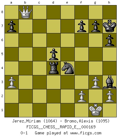 Last move : 0-1 2016 August 2 5:29:47 [Event "FICGS__CHESS__RAPID_E__000169"] [Site "FICGS"] [Date "2016.02.15"] [Round "1"] [White "Jerez,Miriam"] [Black "Bromo,Alexis"] [Result "0-1"] [WhiteElo "1064"] [BlackElo "1095"] 1.e4 e5 2.Nf3 Nc6 3.Nc3 h6 4.g3 Nf6 5.Bg2 Bc5 6.d4 exd4 7.Nb5 Nxe4 8.Bf4 d6 9.O-O O-O 10.Nfxd4 Nxd4 11.Nxd4 Nf6 12.Re1 Re8 13.a3 Rxe1+ 14.Qxe1 Bxd4 15.c3 Bb6 16.b4 c5 17.bxc5 Bxc5 18.c4 Bf5 19.Bxb7 Rb8 20.Ba6 Ne4 21.Be3 Bxe3 22.Qxe3 Rb6 23.c5 Rxa6 24.Rd1 d5 25.Rd4 Qd7 26.Qc1 Ra4 27.c6 Rxd4 28.cxd7 Bxd7 29.Qc7 Bh3 30.Qb8+ Kh7 0-1 This chess game has been lost on time (started : 2016.02.15 22:19:11) Three knights game Kingside Castling by player White (move 9) Kingside Castling by player Black (move 9) Player Black won this chess game. Follow this game move after move (download)A bad day of Chess is better than any good day at work. (Anonymous) Es gibt Leute, die glauben, alles wäre vernünftig, was man mit einem ernsthaften Gesicht tut. (Georg Christoph Lichtenberg) Coloca el contenido del tablero de Ajedrez en un sombrero, agita las piezas vigorosamente, derrámalas en el tablero desde una altura de medio metro y así obtienes el estilo de Wilhelm Steinitz. (H. E. Bird) L'attaque fait le spectacle, la défense gagne les matchs. (Dicton footballistique) Hold em is to stud what chess is to checkers. (Johnny Moss)