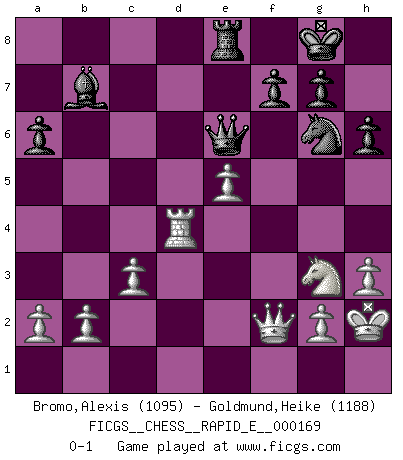 Last move : 0-1 2016 March 26 16:1:2 [Event "FICGS__CHESS__RAPID_E__000169"] [Site "FICGS"] [Date "2016.02.15"] [Round "1"] [White "Bromo,Alexis"] [Black "Goldmund,Heike"] [Result "0-1"] [WhiteElo "1095"] [BlackElo "1188"] 1.d4 b5 2.e4 Bb7 3.Bxb5 Bxe4 4.Ne2 e6 5.Nbc3 Bb7 6.O-O a6 7.Ba4 c5 8.dxc5 Bxc5 9.Be3 Bxe3 10.fxe3 Nf6 11.h3 O-O 12.Ng3 Qc7 13.Qe1 d5 14.Rd1 Nbd7 15.Bxd7 Qxd7 16.e4 d4 17.Nce2 e5 18.c3 d3 19.Nc1 Rad8 20.Nxd3 Qc6 21.Nxe5 Qc5+ 22.Kh2 Qxe5 23.Rxd8 Rxd8 24.Rf5 Qe6 25.e5 h6 26.Qe3 Nd5 27.Qf2 Ne7 28.Rf4 Ng6 29.Rd4 Re8 0-1 Polish defense Kingside Castling by player White (move 6) Kingside Castling by player Black (move 11) Player Black won this chess game. Follow this game move after move (download)Let the perfectionist play postal. (Yasser Seirawan) Mutter, ich bin eben Ex-Weltmeister geworden. --beim nach Hause Kommen nach dem Verlust des WM-Titels an Mihail Botvinnik -- (Mikhail Nekhemyevich Tal) Hay dos clases de hombres: aquellos que se conforman en dejarse llevar por las circunstancias y que juegan barajas y aquellos decididos a controlar las circunstancias y que juegan al Ajedrez. (Mortimer Collins) On est toujours la mazette de quelqu'un d'autre. (Anonyme) Luck is what you have left over after you give 100 percent. (Langston Coleman)