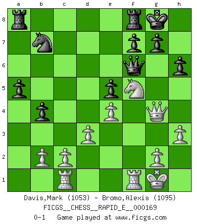 Last move : 0-1 2016 June 22 23:23:23 [Event "FICGS__CHESS__RAPID_E__000169"] [Site "FICGS"] [Date "2016.02.15"] [Round "1"] [White "Davis,Mark"] [Black "Bromo,Alexis"] [Result "0-1"] [WhiteElo "1053"] [BlackElo "1095"] 1.e4 e5 2.Nf3 Nc6 3.Nc3 Nf6 4.Bb5 d6 5.O-O a6 6.Ba4 b5 7.Bb3 h6 8.d3 Bb7 9.a3 Be7 10.h3 O-O 11.Nd5 Nxd5 12.Bxd5 Bf6 13.Nh2 Na5 14.Bxb7 Nxb7 15.Qg4 Bg5 16.Nf3 Bxc1 17.Raxc1 c5 18.Nh4 b4 19.axb4 cxb4 20.Nf5 Qf6 21.f4 a5 22.fxe5 dxe5 0-1 This chess game has been lost on time (started : 2016.02.15 22:19:11) Four knights : Spanish variation Kingside Castling by player White (move 5) Kingside Castling by player Black (move 10) Player Black won this chess game. Follow this game move after move (download)Chess holds its master in its own bonds, shackling the mind and brain so that the inner freedom of the very strongest must suffer. (Albert Einstein) Die größte Kunst beim Schach besteht darin dem Gegner nicht zu zeigen was er tun kann. (Garry Kasparov) Si tu oponente no puede hacer nada activo, entonces no apures la posición; En vez de eso, dejalo estar sentado ahí, sufriendo y rogandote por un empate. (Jeremy Silman) Dieu déplace le joueur, et celui-ci la pièce. Quel Dieu derrière Dieu commence donc la trame ? Arturo Perez-Reverte (prix de littérature policière 1993). Excelling at chess has long been considered a symbol of more general intelligence. That is an incorrect assumption in my view, as pleasant as it might be. But for the purposes of argument and investigation, chess is, in Russkin-Gutman's words, 'an unparalleled laboratory, since both the learning process and the degree of ability obtained can be objectified and quantified, providing an excellent comparative framework on which to use rigorous analytical techniques.' (The Chess Master and the Computer, by Garry Kasparov - 2010)