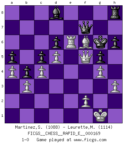Last move : 1-0 2016 August 16 7:57:56 [Event "FICGS__CHESS__RAPID_E__000169"] [Site "FICGS"] [Date "2016.02.15"] [Round "1"] [White "Martinez,Silvio"] [Black "Leurette,Marc-Antoine"] [Result "1-0"] [WhiteElo "1088"] [BlackElo "1114"] 1.e4 e5 2.Nf3 Nc6 3.Bb5 a6 4.Ba4 Nf6 5.O-O Be7 6.Nc3 b5 7.Bb3 O-O 8.d3 h6 9.Be3 d6 10.Nd5 Bb7 11.a3 a5 12.a4 b4 13.h3 Ba6 14.Re1 Nxd5 15.Bxd5 Qd7 16.c4 Rab8 17.b3 g5 18.d4 Kg7 19.dxe5 Nxe5 20.Bd4 f6 21.Re3 c5 22.Bb2 Bb7 23.Rc1 Bxd5 24.exd5 Nxf3+ 25.Qxf3 Rh8 26.Rce1 Rbe8 27.g4 Kg6 28.Re6 Bd8 29.Bxf6 Rxe6 30.Rxe6 Qf7 31.Qf5+ 1-0 This chess game has been lost on time (started : 2016.02.15 22:19:11) Ruy Lopez : Closed defense Kingside Castling by player White (move 5) Kingside Castling by player Black (move 7) Player White won this chess game. Follow this game move after move (download)It's just you and your opponent at the board and you're trying to prove something. (Bobby Fischer) Korrekt heißt in Deutschland die Haltung eines Mannes, dessen Benehmen nach dem Urteile seiner Nachbarn seiner Stellung angemessen ist. Um korrekt zu sein, muß man sich der Meinung der anderen anpassen... (Emanuel Lasker) Con o sin el título, Bobby Fischer fue sin lugar a dudas el mas grande jugador de su época. (Burt Hochberg) La solitude du joueur d'Echecs à l'approche du mat est semblable à celle du condamné. (Francis Szpiner) Dave, my mind is going. I can feel it. (HAL 9000 in 2001, a space odyssey)