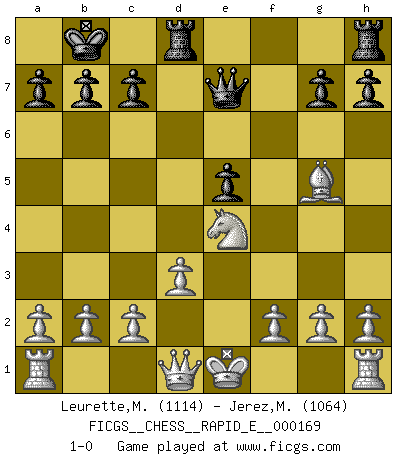 Last move : 1-0 2016 June 11 22:29:41 [Event "FICGS__CHESS__RAPID_E__000169"] [Site "FICGS"] [Date "2016.02.15"] [Round "1"] [White "Leurette,Marc-Antoine"] [Black "Jerez,Miriam"] [Result "1-0"] [WhiteElo "1114"] [BlackElo "1064"] 1.e4 e5 2.Nf3 Nc6 3.Bc4 Nf6 4.Ng5 d5 5.exd5 Nxd5 6.d3 Bc5 7.Nc3 Nce7 8.Nxd5 Nxd5 9.Bxd5 Be6 10.Bxe6 fxe6 11.Nxe6 Qe7 12.Nxc5 O-O-O 13.Ne4 Kb8 14.Bg5 1-0 This chess game has been lost on time (started : 2016.02.15 22:19:11) Two knights defense Queenside Castling by player Black (move 12) Player White won this chess game. Follow this game move after move (download)Chess is a terrible game. If you have no center, your opponent has a freer position. If you do have a center, then you really have something to worry about ! (Siegbert Tarrasch) Alle offensichtlichen Züge sehen nach dem Spiel in der Analyse verdächtig aus. (Viktor Kortschnoi) Nos gusta pensar. (Gary Kasparov) Les échecs c'est le défi de l'alpiniste, toujours plus haut, prêt à tout pour monter à l'assaut du Roi ennemi. Les échecs, c'est de la musique en mouvement, un ballet majestueux pour les yeux. C'est de la poésie composée par les fantômes du passé qui au même titre que Rimbaud ou Verlaine méritent notre admiration. Les échecs, c'est de la peinture ou le moindre mouvement modifie le tableau pour en faire un Picasso ou un Van Gogh. Les échecs, c'est tout et rien, c'est la vie et la mort. Jjulie33 sur le forum de France-Echecs. Computer Science is no more about computers than astronomy is about telescopes. (Edsger W. Dijkstra)