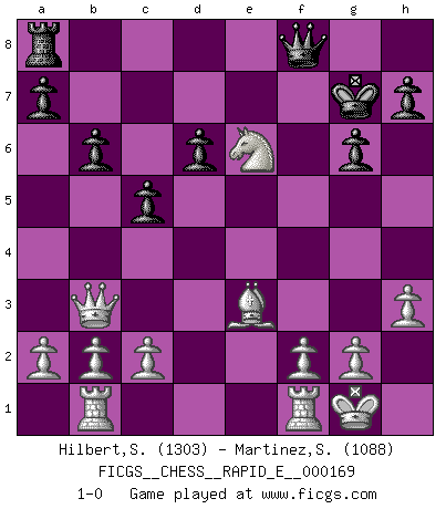 Last move : 1-0 2016 April 13 21:34:13 [Event "FICGS__CHESS__RAPID_E__000169"] [Site "FICGS"] [Date "2016.02.15"] [Round "1"] [White "Hilbert,Stephan J."] [Black "Martinez,Silvio"] [Result "1-0"] [WhiteElo "1303"] [BlackElo "1088"] 1.e4 Nc6 2.Nf3 d6 3.d4 Bg4 4.Be3 e5 5.h3 Bh5 6.Be2 Nf6 7.Na3 Nxe4 8.O-O exd4 9.Nxd4 Bxe2 10.Qxe2 Be7 11.Nf5 O-O 12.Qg4 g6 13.Nh6+ Kg7 14.Qxe4 Bf6 15.Rab1 Re8 16.Qc4 Ne5 17.Qb3 b6 18.Nc4 Bg5 19.Nxe5 Re7 20.Nexf7 Rxf7 21.Nxf7 Qf8 22.Nxg5 c5 23.Ne6+ 1-0 This chess game has been lost on time (started : 2016.02.15 22:19:11) KP : Nimzovich defense Kingside Castling by player White (move 8) Kingside Castling by player Black (move 11) Player White won this chess game. Follow this game move after move (download)You must take your opponent into a deep dark forest where 2+2=5, and the path leading out is only wide enough for one. (Mikhail Tal) Das Schach hält seine Meister in eigenen Banden, Fesseln; auf vielerlei Weise formt es ihren Geist, so dass die innere Freiheit selbst des Stärksten beeinflusst wird. (Albert Einstein) Aquel que ve no otra dirección en el juego que la de dar Jaque Mate a su oponente, nunca será un buen jugador de Ajedrez. (Euwe) Les échecs sont un jeu par leur forme, un art par leur essence et une science par sa difficulté d'acquisition. Ils peuvent vous procurer autant de plaisir qu'un bon livre ou une belle musique, mais vous n'aurez une réelle joie que si vous arrivez à bien jouer. (Tigran Petrosian) Difficult things take a long time, impossible things a little longer. (Author unknown)