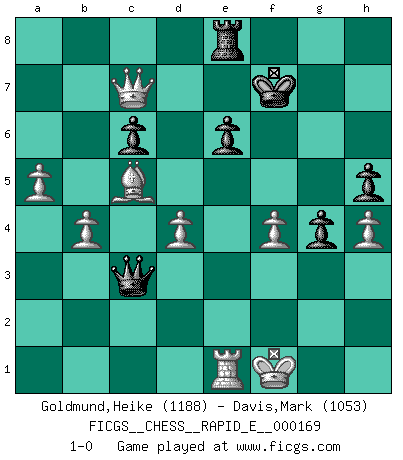 Last move : 1-0 2016 July 12 13:33:35 [Event "FICGS__CHESS__RAPID_E__000169"] [Site "FICGS"] [Date "2016.02.15"] [Round "1"] [White "Goldmund,Heike"] [Black "Davis,Mark"] [Result "1-0"] [WhiteElo "1188"] [BlackElo "1053"] 1.e4 e5 2.Nf3 Nc6 3.Bc4 Nf6 4.Ng5 d5 5.exd5 Na5 6.Bb5+ c6 7.dxc6 bxc6 8.Ba4 Bd7 9.O-O Be7 10.Re1 e4 11.Nxe4 O-O 12.d4 Nc4 13.Bb3 Nxe4 14.Rxe4 Re8 15.Bxc4 Bf5 16.Re1 Bf6 17.Be3 Qd7 18.c3 Rab8 19.b4 Bg4 20.Qc2 Bf5 21.Bd3 Bxd3 22.Qxd3 Qg4 23.Nd2 Rbd8 24.Nf3 h6 25.h3 Qd7 26.Bf4 Re6 27.Rxe6 fxe6 28.Ne5 Bxe5 29.Bxe5 Rf8 30.Re1 Qf7 31.Qg3 g5 32.f4 Qf5 33.h4 g4 34.Qf2 h5 35.g3 Qd3 36.Qe3 Qc4 37.a4 Qb3 38.a5 a6 39.Bd6 Re8 40.Bc5 Qd5 41.Qd3 Kg7 42.Qxa6 Qf3 43.Qb7+ Kf6 44.Qc7 Qxg3+ 45.Kf1 Qf3+ 46.Kg1 Qg3+ 47.Kf1 Qxc3 48.Qe5+ Kf7 49.Qc7+ 1-0 This chess game has been lost on time (started : 2016.02.15 22:19:11) Two knights defense Kingside Castling by player White (move 9) Kingside Castling by player Black (move 11) Player White won this chess game. Follow this game move after move (download)You know you're going to lose. Even when I was ahead I knew I was going to lose. - On playing against Fischer. (Andrew Soltis) Ich organisiere ein großes Turnier, was mich etwa 120000 Dollar kostet. Ich denke, das ist das erste Mal in der Schachgeschichte, daß ein Schachgroßmeister auch als Mäzen auftritt. (Miguel Najdorf) Una victoria por una combinación errónea, aunque sea espectacular, me llena de horror artístico. (Wilhelm Steinitz) Même si vous avez un bon coup à faire, regardez toujours s'il n'y en a pas un qui lui soit préférable. (Pedro Damiano) Drag your thoughts away from your troubles... by the ears, by the heels, or any other way you can manage it. (Mark Twain)
