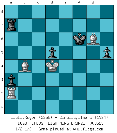 Last move : 1/2-1/2 2016 February 16 17:55:29 [Event "FICGS__CHESS__LIGHTNING_BRONZE__000623"] [Site "FICGS"] [Date "2016.02.16"] [Round "1"] [White "Llull,Roger"] [Black "Cirulis,Ilmars"] [Result "1/2-1/2"] [WhiteElo "2258"] [BlackElo "1924"] 1.b4 e5 2.Bb2 Bxb4 3.Bxe5 Nf6 4.Nf3 O-O 5.e3 d5 6.c4 Bf5 7.a3 Ba5 8.cxd5 Nxd5 9.Qb3 Nc6 10.Bb2 Qd6 11.Be2 Rad8 12.O-O Rfe8 13.d4 Re6 14.Nc3 Bxc3 15.Bxc3 Rg6 16.Rac1 Be4 17.g3 Nxe3 18.fxe3 Rxg3+ 19.Kf2 Rh3 20.Ke1 Bd5 21.Qb2 Re8 22.Qd2 Qxa3 23.Rf2 Qe7 24.Bb2 b6 25.Kf1 f6 26.Qd3 Qd7 27.Rc3 Nb4 28.Qb5 Qxb5 29.Bxb5 c6 30.Be2 b5 31.Ke1 a5 32.Kd2 a4 33.Ne1 Rh4 34.Rc5 Na6 35.Rc1 Nc7 36.Ba3 Ne6 37.Nf3 Rh3 38.Rc3 Be4 39.Bd6 Ra8 40.Rc1 a3 41.Ra1 a2 42.Bg3 Ra3 43.Ne1 f5 44.Bf1 Rh6 45.Bd6 Ra4 46.Be5 g5 47.Nd3 f4 48.exf4 gxf4 49.Nxf4 Nxf4 50.Rxf4 Rxh2+ 51.Be2 Bg6 52.Rg4 Rh3 53.d5 cxd5 54.Rxa4 bxa4 55.Rxa2 a3 56.Ra1 Rb3 57.Bc3 Rb2+ 58.Ke3 Rb3 59.Kd4 Kf8 60.Bf3 Be4 61.Bh5 Bg6 62.Bg4 Ke7 63.Ra2 Bf7 64.Re2+ Kd6 65.Rf2 h5 66.Bh3 Ke7 67.Bf5 Rb7 68.Ra2 Ra7 69.Bb4+ Kf6 70.Bc2 Bg6 71.Bxg6 1/2-1/2 Polish (Sokolsky) opening Kingside Castling by player Black (move 4) Kingside Castling by player White (move 12) 10 pieces endgame at move 55 : White KRBB , Black KRBPPP WHITE : King + 1 Rook 2 Bishops BLACK : King + 1 Rook 1 Bishop 3 Pawns 9 pieces endgame at move 71 : White KRBB , Black KRPPP WHITE : King + 1 Rook 2 Bishops BLACK : King + 1 Rook 3 Pawns This chess game ended in a draw. Follow this game move after move (download)Fischer Chess play was always razor-sharp, rational and brilliant. One of the best ever. (Dave Regis) Konzentriere dich auf materielle Gewinne. Nimm, was dir dein Gegner gibt, ausser es gibt einen guten Grund der dagegenspricht. (Robert James Fischer) Nos gusta pensar. (Gary Kasparov) L'attaque fait le spectacle, la défense gagne les matchs. (Dicton footballistique) Luck never gives; it only lends. (Swedish proverb)