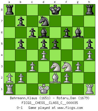 Last move : 0-1 2007 April 16 2:8:44 [Event "FICGS__CHESS__CLASS_C__000035"] [Site "FICGS"] [Date "2007.03.21"] [Round "1"] [White "Behrmann,Klaus"] [Black "Rotaru,Dan"] [Result "0-1"] [WhiteElo "1651"] [BlackElo "1679"] 1.e4 c6 2.d4 d5 3.e5 Bf5 4.c3 e6 5.Be3 Nd7 6.Nd2 Qc7 7.Ngf3 f6 8.Bf4 Ne7 9.Bg3 Qb6 10.Qb3 Ng6 11.exf6 gxf6 12.h4 h5 13.Qxb6 axb6 14.Be2 Bh6 15.Bd6 Nf4 16.Bxf4 Bxf4 17.g3 Bd6 18.Nf1 b5 19.Ne3 Bg6 20.Kd1 e5 0-1 Caro-Kann : Advance variation Player Black won this chess game. Follow this game move after move (download)A sacrifice is best refuted by accepting it. (Wilhelm Steinitz) Modernes Schach sorgt sich zuviel um Dinge wie Bauernstruktur usw. Vergessen Sie das, Schachmatt beendet das Spiel! (Nigel Short) Cuando tengo las piezas blancas, yo gano porque soy blanco; Cuando tengo las piezas negras, yo gano porque soy Bogolyubov. (Bogolyubov) Dans le domaine de la peinture, de la gravure et de la sculpture, dès la première décennie de notre siècle, les artistes abandonnent la représentation de la partie d'échecs pour se concentrer sur les pièces, sur les échiquiers et sur toutes les variations auxquelles les unes et les autres peuvent donner lieu. On passe en quelque sorte d'un thème social à un thème musical (au sens de la musica médiévale, c'est-à-dire d'une notion qui inclue le rythme, l'harmonie, la construction et la déconstruction, etc.). Graphiquement et picturalement, l'échiquier apparaît comme une structure ouverte, dynamique, d'une richesse infinie, autorisant toutes les combinatoires et débouchant sur des mouvements et des rythmes de nature exponentielle. (Michel Pastoureau) The absolute truth is the thing that makes people laugh. (Carl Reiner)