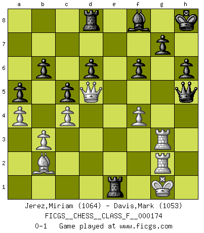 Last move : 0-1 2017 February 13 15:20:27 [Event "FICGS__CHESS__CLASS_F__000174"] [Site "FICGS"] [Date "2016.02.17"] [Round "1"] [White "Jerez,Miriam"] [Black "Davis,Mark"] [Result "0-1"] [WhiteElo "1064"] [BlackElo "1053"] 1.e4 e5 2.Nf3 d6 3.Nc3 Nf6 4.g3 Nc6 5.Bg2 Be7 6.O-O O-O 7.d4 exd4 8.Nxd4 Nxd4 9.Qxd4 Bg4 10.b3 c5 11.Qd2 a6 12.Re1 Rb8 13.h3 Bh5 14.Bb2 Re8 15.a4 Qc7 16.g4 Bg6 17.Nd5 Nxd5 18.Qxd5 b6 19.c4 Rbd8 20.Rad1 Kh8 21.Qd2 f6 22.h4 Bf7 23.Re3 h6 24.Bh3 Bf8 25.Qe2 Qc6 26.Bg2 Qc7 27.Bc3 Bg6 28.h5 Bh7 29.Bb2 Rd7 30.Kf1 a5 31.Qf3 Be7 32.Bh3 R7d8 33.Bc3 Qc6 34.R1d3 Bf8 35.Kg1 Qc7 36.Rd2 Qb8 37.Bb2 Be7 38.Qg3 Qb7 39.f4 Bxe4 40.Rde2 Bc6 41.Bg2 Bxg2 42.Qxg2 Qd7 43.Qe4 Qxg4+ 44.Rg2 Qxh5 45.Reg3 Bf8 46.Qd5 Re1+ 0-1 Philidor's defense Kingside Castling by player White (move 6) Kingside Castling by player Black (move 6) Player Black won this chess game. Follow this game move after move (download)When I asked Fischer why he had not played a certain move in our game, he replied: 'Well, you laughed when I wrote it down !' (Mikhail Tal) Alles was ich jemals tun will ist Schach spielen. (Robert James Fischer) Cuando no sepas que mover, espera por una idea que se le venga a la la cabeza de tu oponente. Tenlo por seguro de que esa idea estará incorrecta. (Siegbert Tarrasch) L'action d'une oeuvre littéraire se déroule sur un champ de bataille. Les masques et les types du drame moderne correspondent aux pièces du jeu d'échecs. L'intrigue correspond aux coups et aux gambits, c'est à dire aux techniques du jeu telles qu'utilisées et interprétées par les joueurs. Les tactiques et les péripéties [mouvements] correspondent aux coups exécutés par l'adversaire. (Viktor Shklovsky) The absolute truth is the thing that makes people laugh. (Carl Reiner)