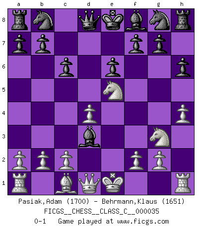 Last move : 0-1 2007 May 10 14:33:9 [Event "FICGS__CHESS__CLASS_C__000035"] [Site "FICGS"] [Date "2007.03.21"] [Round "1"] [White "Pasiak,Adam"] [Black "Behrmann,Klaus"] [Result "0-1"] [WhiteElo "1700"] [BlackElo "1651"] 1.e4 c6 2.d4 d5 3.Nc3 dxe4 4.Nxe4 Bf5 5.Ng3 Bg6 6.Nf3 e6 7.h4 h6 8.Ne5 Bh7 9.Bd3 Bxd3 0-1 This chess game has been lost on time (started : 2007.03.21 2:13:31) Caro-Kann : Classical variation Player Black won this chess game. Follow this game move after move (download)No price is too great for the scalp of the enemy King. (Koblentz) Ein Schachspiel besteht aus drei Phasen: Die erste, wenn du hofftst den Vorteil zu haben, die zweite, wenn du glaubst einen Vorteil zu haben, und die dritte.... wenn du weißt Du wirst verlieren. (Savielly Grigorievitsch Tartakower) El Ajedrez se juega con la mente... ¡no con las manos!. (Renaud y Kahn) Les échecs sont plus proches de l'art de l'assassinat que de l'art de la guerre. (Arturo Perez-Reverte) The meaning of life is that it is to be lived, and it is not to be traded and conceptualized and squeezed into a pattern of systems. (Bruce Lee)