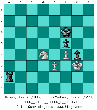 Last move : 0-1 2016 June 13 15:24:49 [Event "FICGS__CHESS__CLASS_F__000174"] [Site "FICGS"] [Date "2016.02.17"] [Round "1"] [White "Bromo,Alexis"] [Black "Piantadosi,Angelo"] [Result "0-1"] [WhiteElo "1095"] [BlackElo "1270"] 1.d4 d5 2.c4 e6 3.Nc3 Nf6 4.e3 dxc4 5.Bxc4 a6 6.a3 b5 7.Ba2 Bb7 8.Nf3 Nbd7 9.b4 Be7 10.O-O O-O 11.h3 Nd5 12.Nxd5 exd5 13.Bb2 a5 14.Re1 axb4 15.axb4 Bxb4 16.Re2 c5 17.dxc5 Nxc5 18.Bd4 Ne4 19.Bb2 Bc3 20.Bxc3 Nxc3 21.Qd2 Nxe2+ 22.Qxe2 Re8 23.Rc1 Rc8 24.Rxc8 Qxc8 25.Qxb5 Bc6 26.Qd3 Qa8 27.Bb1 g6 28.h4 d4 29.Nxd4 Bxg2 30.h5 Be4 31.Qb5 Bxb1 32.Qxb1 Qe4 33.Qxe4 Rxe4 34.hxg6 hxg6 35.Kg2 Kg7 36.Kf3 f5 37.Ke2 Kf6 38.f3 Re8 39.f4 g5 40.Kf3 g4+ 41.Kf2 Ra8 42.Kg3 Ra2 0-1 QGD : 3...Nf6 Kingside Castling by player White (move 10) Kingside Castling by player Black (move 10) 10 pieces endgame at move 33 : White KNPPP , Black KRPPP WHITE : King + 1 Knight 3 Pawns BLACK : King + 1 Rook 3 Pawns 9 pieces endgame at move 34 : White KNPPP , Black KRPP WHITE : King + 1 Knight 3 Pawns BLACK : King + 1 Rook 2 Pawns 8 pieces endgame at move 34 : White KNPP , Black KRPP WHITE : King + 1 Knight 2 Pawns BLACK : King + 1 Rook 2 Pawns Player Black won this chess game. Follow this game move after move (download)Dazzling combinations are for the many, shifting wood is for the few. (Georg Kieninger) Schach ist das Spiel, das die Verrückten gesund hält. (Albert Einstein) El Ajedrez es un juego de pelea el cual es puramente intelectual e incluye la suerte. (Richard Reti) Le plus grand jeu de l'esprit jamais inventé, plus vous l'apprenez, plus vous y prenez du plaisir. (Garry Kasparov) Games, world of games... There's always an opponent, and there's always a victim. (Revolver, movie)