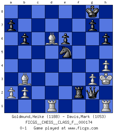 Last move : 0-1 2016 May 28 3:24:45 [Event "FICGS__CHESS__CLASS_F__000174"] [Site "FICGS"] [Date "2016.02.17"] [Round "1"] [White "Goldmund,Heike"] [Black "Davis,Mark"] [Result "0-1"] [WhiteElo "1188"] [BlackElo "1053"] 1.e4 c5 2.c3 Nc6 3.d4 cxd4 4.Bc4 Ne5 5.Bb3 Nf6 6.Qxd4 Nc6 7.Qd2 e6 8.Nf3 Bc5 9.Qg5 Bxf2+ 10.Kxf2 O-O 11.Be3 d5 12.exd5 exd5 13.Nbd2 Be6 14.Rad1 Qc7 15.c4 Ne7 16.Bf4 Qb6+ 17.Be3 Qa5 18.h4 h6 19.Qg3 Nh5 20.Qe5 Nf6 21.cxd5 Nexd5 22.Nc4 Qb5 23.Nd4 Qe8 24.Nxe6 fxe6 25.Nd6 Qe7 26.g3 Ng4+ 27.Kg2 Nxe5 28.Bc5 Ne3+ 29.Bxe3 Rad8 30.Bc5 b6 31.Ba3 Rxd6 32.Bxd6 Qb7+ 33.Kh2 Rf2+ 34.Kh3 Qg2+ 0-1 Sicilian : Alapin's variation (2.c3) Kingside Castling by player Black (move 10) Player Black won this chess game. Follow this game move after move (download)By playing at Chess then, we may learn: First: Foresight... Second: Circumspection... Third: Caution... And lastly, we learn by Chess the habit of not being discouraged by present bad appearances in the state of our affairs, the habit of hoping for a favorable chance, and that of persevering in the secrets of resources. (Benjamin Franklin) Alle Schachspieler sollten auch ein Hobby haben. (Savielly Grigorievitsch Tartakower) El hombre es un frívolo, una creatura engañosa y como un jugador de Ajedrez, se preocupa mas por el proceso de obtener su meta que de la meta por sí misma. (Dostoyevsky) Les ravages du H expliquent la différence de niveau entre Tal et Thal [Abergel]. Art is the triumph over chaos. (John Cheever)