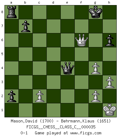 Last move : 0-1 2007 May 16 15:56:3 [Event "FICGS__CHESS__CLASS_C__000035"] [Site "FICGS"] [Date "2007.03.21"] [Round "1"] [White "Mason,David"] [Black "Behrmann,Klaus"] [Result "0-1"] [WhiteElo "1700"] [BlackElo "1651"] 1.e4 c6 2.Nc3 d5 3.Nf3 dxe4 4.Nxe4 Nd7 5.d4 e6 6.Bd3 Ngf6 7.Ng3 c5 8.O-O Bd6 9.dxc5 Bxg3 10.fxg3 Nxc5 11.Bb5+ Bd7 12.Bxd7+ Qxd7 13.Qe2 O-O 14.Bg5 Nce4 15.Rad1 Qc7 16.Bxf6 Nxf6 17.Ne1 Qb6+ 18.Kh1 Qxb2 19.Nd3 Qxa2 20.Ne5 h6 21.Rxf6 gxf6 22.Qg4+ Kh7 23.Nd7 Rfd8 24.Nxf6+ Kh8 25.Nh5 Rxd1+ 26.Qxd1 Qd5 27.Qa1+ e5 28.Qf1 Qe6 29.h3 a5 30.Nf6 a4 31.Ne4 a3 32.Qa1 a2 33.Nc3 f6 34.g4 e4 35.Nxe4 Qxe4 36.Qxf6+ Kg8 0-1 Caro-Kann : Two knights variation Kingside Castling by player White (move 8) Kingside Castling by player Black (move 13) Player Black won this chess game. Follow this game move after move (download)On the chessboard, lies and hypocrisy do not survive long. (Emanuel Lasker) Ich verstehe Aljechins Kombinationen ganz gut; aber woher er diese Angriffschancen bekommt und wie er die Eröffnung behandelt das ist für mich ein Buch mit sieben Siegeln. (Rudolf Spielmann) Me gusta decir que Bobby Fischer fue el mejor jugador que jamás haya existido. Pero lo que hizo de Fischer un genio, fue su habilidad de mezclar una frescura y pragmatismo Americano con ideas Rusas acerca de la estrategia. (Bruce Pandolfini) Je crois qu'il existe des manières très spécifiques de jouer efficacement contre une machine. Evidemment, nous n'avons aucune chance en technique pure, parce que l'ordinateur calcule de manière parfaite. Mais lorsque nous faisons appel à notre cerveau, en utilisant l'intuition et la compréhension, alors nous restons beaucoup plus forts. (Anatoli Karpov) . 'gn is not allowed in chess unless n is an integer between 1 and 8 inclusive, where 1 and 8 are to interpreted as the standard numerals standing for integers in the ordered real-closed field R, with the *canonical* ordering. (As opposed to, say, an integer in the domain Z[2+i*sqrt(5)] or an integer in some exotic Grothendieck topos). (Normajean Yates)