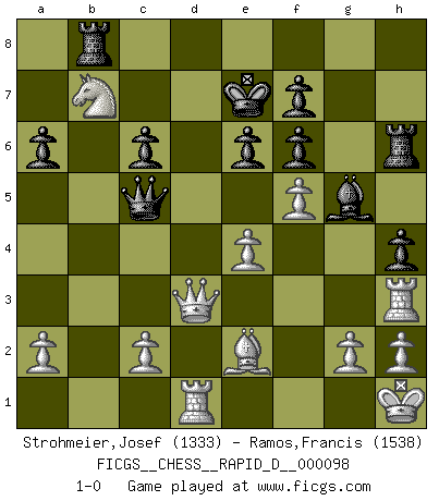 Last move : 1-0 2016 April 2 17:16:32 [Event "FICGS__CHESS__RAPID_D__000098"] [Site "FICGS"] [Date "2016.02.17"] [Round "1"] [White "Strohmeier,Josef"] [Black "Ramos,Francis"] [Result "1-0"] [WhiteElo "1333"] [BlackElo "1538"] 1.e4 c5 2.Nf3 d6 3.d4 cxd4 4.Nxd4 Nf6 5.Nc3 a6 6.Bg5 e6 7.f4 Qb6 8.Qd2 Qxb2 9.Rb1 Qa3 10.Bxf6 gxf6 11.Be2 h5 12.O-O Nc6 13.Nxc6 bxc6 14.Kh1 h4 15.Rf3 Qc5 16.f5 Bh6 17.Qd3 Bg5 18.Rh3 Rh6 19.Rd1 Ke7 20.Na4 Qe5 21.Nb6 Rb8 22.Nc4 Qc5 23.Nxd6 Bb7 24.Nxb7 1-0 Sicilian : Najdorf, 7...Qb6 Kingside Castling by player White (move 12) Player White won this chess game. Follow this game move after move (download)Chess is a fighting game which is purely intellectual and includes chance. (Richard Reti) Im Leben werden Partien nie so unstrittig gewonnen wie im Spiel (Emanuel Lasker) A través de las casillas del tablero, los Indios explican el movimiento del tiempo y la edad, las influencias mas altas que controlan el mundo y los lazos que vinculan al Ajedrez con el alma humana. (Al-Masudi) L'ordinateur a tué l'originalité. Il n'y a plus guère d'aventures sur l'échiquier. (Jacob Murray) Pretend inferiority and encourage his arrogance. (Sun Tzu)
