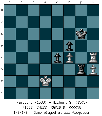 Last move : 1/2-1/2 2016 April 2 17:13:21 [Event "FICGS__CHESS__RAPID_D__000098"] [Site "FICGS"] [Date "2016.02.17"] [Round "1"] [White "Ramos,Francis"] [Black "Hilbert,Stephan J."] [Result "1/2-1/2"] [WhiteElo "1538"] [BlackElo "1303"] 1.e4 d5 2.exd5 Qxd5 3.Nc3 Qa5 4.d4 Nf6 5.Nf3 Bf5 6.Bc4 e6 7.Ne5 c6 8.O-O Nbd7 9.Re1 Bd6 10.f4 O-O 11.Bd3 c5 12.Nc4 Qc7 13.Nxd6 Qxd6 14.Bxf5 exf5 15.dxc5 Qxd1 16.Rxd1 Nxc5 17.Be3 Nce4 18.Nxe4 fxe4 19.h3 Rfd8 20.Kf2 Nd5 21.Rd4 Nxe3 22.Kxe3 f5 23.Rad1 Rxd4 24.Rxd4 Rc8 25.c4 Rc7 26.b4 Kf7 27.c5 Ke6 28.g4 g6 29.a4 a5 30.Rd6+ Ke7 31.Rb6 axb4 32.Rxb4 Kd7 33.gxf5 gxf5 34.a5 Kc6 35.Rb6+ Kd7 36.a6 bxa6 37.Rxa6 Rxc5 38.Rh6 Rc3+ 39.Kd2 Rf3 40.Rxh7+ Ke6 41.Rh6+ Kf7 42.Rh4 Kg6 43.Ke2 Ra3 44.Kd2 Rg3 1/2-1/2 Scandinavian defense Kingside Castling by player White (move 8) Kingside Castling by player Black (move 10) 10 pieces endgame at move 37 : White KRPPP , Black KRPPP WHITE : King + 1 Rook 3 Pawns BLACK : King + 1 Rook 3 Pawns 9 pieces endgame at move 37 : White KRPP , Black KRPPP WHITE : King + 1 Rook 2 Pawns BLACK : King + 1 Rook 3 Pawns 8 pieces endgame at move 40 : White KRPP , Black KRPP WHITE : King + 1 Rook 2 Pawns BLACK : King + 1 Rook 2 Pawns This chess game ended in a draw. Follow this game move after move (download)Any material change in a position must come about by mate, a capture, or a Pawn promotion. (Purdy) Ich brauche nur einen Blick auf das Schachbrett zu werfen, und weiß schon, was in der Stellung steckt, was geschehen kann und was geschehen wird. Alle übrigen suchen und prüfen, ich aber weiß es! (José Raúl Capablanca) Existen dos clases de sacrificios: los correctos y los míos. (Mikhail Tal) Il vaut toujours mieux jouer un plan faux de façon logique que de n'avoir pas de plan du tout. (Victor Kortchnoï) In God we trust, all others we virus scan. (Anonymous)