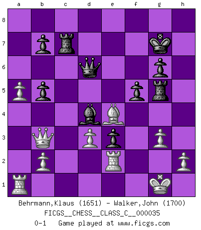 Last move : 0-1 2007 April 30 7:45:54 [Event "FICGS__CHESS__CLASS_C__000035"] [Site "FICGS"] [Date "2007.03.21"] [Round "1"] [White "Behrmann,Klaus"] [Black "Walker,John"] [Result "0-1"] [WhiteElo "1651"] [BlackElo "1700"] 1.e4 c5 2.f4 d5 3.exd5 Nf6 4.c4 e6 5.dxe6 Bxe6 6.Nf3 Nc6 7.d3 g6 8.Be2 Bg7 9.O-O O-O 10.Nc3 Re8 11.Kh1 Bd7 12.Rb1 Nd4 13.Nxd4 cxd4 14.Nb5 Bxb5 15.cxb5 Nd5 16.Bf3 Ne3 17.Bxe3 dxe3 18.Qb3 Qb6 19.Be4 Rac8 20.Rbe1 Rc5 21.a4 Bd4 22.f5 Re7 23.fxg6 hxg6 24.Re2 Rd7 25.g3 a6 26.Qa2 axb5 27.a5 Qd6 28.Kg2 Rdc7 29.Qb3 Rg5 30.Ra1 Kg7 31.Kg1 f5 0-1 Sicilian : Grand Prix attack Kingside Castling by player White (move 9) Kingside Castling by player Black (move 9) Player Black won this chess game. Follow this game move after move (download)The only thing Chess players have in common is Chess. (Lodewijk Prins) Garry Kasparov war erst in der Großmeister-Organisation GMA, dann in der Profischach-Vereinigung PCA, zum Schluss kehrte er wieder in den Schoß der FIDE zurück. Aber gut, manche Leute sind flexibel (Viswanathan Anand) Las ideas audaces son como las piezas del Ajedrez que avanzan hacia adelante. Ellas pueden ser vencidas, pero también pueden iniciar una partida victoriosa. (Goethe) Ce n'est pas pour s'amuser qu'il joue aux échecs : il célèbre un culte. (Vladimir Nabokov) I couldn't make any sense out of what this particular thread is about. It sounds like R2 D2 computer speaking. A space fight ?!? Some 'command' problems in Moscow ? Some killers & narcotic addicts attacking some game & a god wannabe ?? (Dinesh De Silva, lost in a russian conflict in FICGS forum)