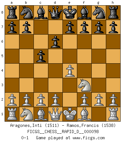 Last move : 0-1 2016 March 22 6:53:49 [Event "FICGS__CHESS__RAPID_D__000098"] [Site "FICGS"] [Date "2016.02.17"] [Round "1"] [White "Aragones,Inti"] [Black "Ramos,Francis"] [Result "0-1"] [WhiteElo "1511"] [BlackElo "1538"] 1.e4 c5 2.Nf3 d6 0-1 This chess game has been lost on time (started : 2016.02.17 14:43:23) Sicilian Player Black won this chess game. Follow this game move after move (download)Nonsense was the last thing Fischer was interested in, as far as Chess was concerned. (Elie Agur) Schach ist Leben. (Robert James Fischer) Aquel que teme a un Peón de Reina aislado, debería de retirarse del Ajedrez. (Siegbert Tarrasch) Vouloir jouer aux échecs contre soi-même est aussi paradoxal que vouloir marcher sur son ombre. (Stefan Zweig) It's only after you lost everything, Tyler says, that you're free to do anything. (Chuck Palahniuk, Fight Club)