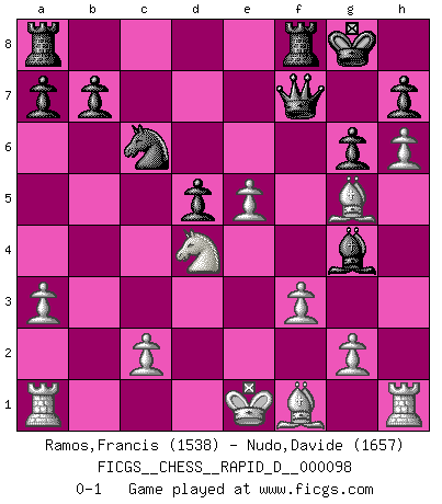 Last move : 0-1 2016 March 7 13:1:27 [Event "FICGS__CHESS__RAPID_D__000098"] [Site "FICGS"] [Date "2016.02.17"] [Round "1"] [White "Ramos,Francis"] [Black "Nudo,Davide"] [Result "0-1"] [WhiteElo "1538"] [BlackElo "1657"] 1.e4 e6 2.d4 d5 3.Nc3 Bb4 4.e5 c5 5.a3 Bxc3+ 6.bxc3 Ne7 7.Qg4 O-O 8.h4 Nf5 9.h5 Nc6 10.h6 g6 11.Ne2 cxd4 12.cxd4 f6 13.exf6 Qxf6 14.Bg5 Qf7 15.f3 e5 16.dxe5 Nfd4 17.Nxd4 Bxg4 0-1 French : Winawer, Advance, poisoned pawn variation Kingside Castling by player Black (move 7) Player Black won this chess game. Follow this game move after move (download)The mistakes are there, waiting to be made. (Savielly Tartakower) Spiel ein langweiliges Spiel zu Ende und lustige Dinge können passieren. (Hans Ree) El Ajedrez, como cualquier actividad creativa, solo puede existir a través del esfuerzo combinado de aquellos que tienen talento creativo y de aquellos que poseen la habilidad de organizar su trabajo creativo. (Mikhail Botvinnik) J'ai toujours senti une vague pitié pour l'homme qui ne connaît rien aux échecs, tout comme j'en aurais pour un homme ignorant de l'amour. Les Echecs, comme la musique ou comme l'amour, ont le pouvoir de rendre heureux. (Siegbert Tarrasch) Work expands to fill the time available. (C. Northcote Parkinson, in Parkinson's Laws)