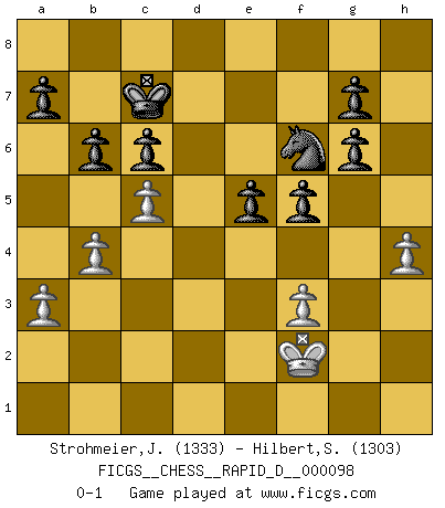 Last move : 0-1 2016 June 27 21:37:44 [Event "FICGS__CHESS__RAPID_D__000098"] [Site "FICGS"] [Date "2016.02.17"] [Round "1"] [White "Strohmeier,Josef"] [Black "Hilbert,Stephan J."] [Result "0-1"] [WhiteElo "1333"] [BlackElo "1303"] 1.e4 d5 2.exd5 Qxd5 3.Nc3 Qa5 4.d4 Nf6 5.Bc4 Bg4 6.f3 Bh5 7.Nge2 e6 8.O-O c6 9.Re1 Nbd7 10.Ng3 Bg6 11.Bd3 O-O-O 12.Bd2 Qc7 13.a3 Nb6 14.Be3 Nbd5 15.Nxd5 Nxd5 16.Bf2 Nf4 17.Bxg6 hxg6 18.Be3 Nd5 19.Bf2 Bd6 20.c3 Nf4 21.b4 Nh5 22.Nf1 Nf4 23.Bg3 Rh6 24.c4 Nh5 25.Bxd6 Qxd6 26.Re4 Nf6 27.Re1 Qxd4+ 28.Qxd4 Rxd4 29.Rac1 Rdh4 30.h3 Nh5 31.c5 Nf4 32.Rcd1 Nd5 33.Re4 Rxe4 34.fxe4 Nc3 35.Rd3 Nxe4 36.Rf3 f5 37.Ng3 Ng5 38.Rd3 Rh4 39.Ne2 Ne4 40.Nd4 Ng5 41.Re3 Rxd4 42.Kf2 Rd2+ 43.Kg3 Ne4+ 44.Kh2 Kc7 45.h4 Rd8 46.Kh3 Rd3 47.Rf3 Rxf3+ 48.gxf3 Nf6 49.Kg3 e5 50.Kf2 b6 0-1 Scandinavian (centre counter) defense Kingside Castling by player White (move 8) Queenside Castling by player Black (move 11) Player Black won this chess game. Follow this game move after move (download)Pawns are born free, yet they are everywhere in chains. (Rick Kennedy) Kasparov ist eine Art Monster mit hundert Augen, denen auch nicht das Geringste entgeht. (Tony Miles) Una buena memoria, concentración, imaginación y una fuerte voluntad, se requiere para llegar a ser un buen jugador. (Bobby Fischer) Aucun coup ne doit être joué sans but. (Pedro Damiano) The hypothalamus is one of the most important parts of the brain, involved in many kinds of motivation, among other functions. The hypothalamus controls the 'Four Fs: Fighting, Fleeing, Feeding and Mating. (Unknown author)