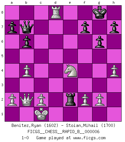 Last move : 1-0 2006 July 19 19:36:41 [Event "FICGS__CHESS__RAPID_B__000006"] [Site "FICGS"] [Date "2006.05.31"] [Round "1"] [White "Benitez,Ryan"] [Black "Stoian,Mihail"] [Result "1-0"] [WhiteElo "1602"] [BlackElo "1700"] 1.d4 Nf6 2.Nc3 g6 3.e4 d6 4.Nf3 Bg4 5.h3 Bxf3 6.Qxf3 Nc6 7.Be3 Bg7 8.O-O-O O-O 9.e5 Nd7 10.Bb5 Na5 11.h4 c6 12.Be2 c5 13.exd6 cxd4 14.Bxd4 Bxd4 15.Rxd4 exd6 16.Rxd6 Qe7 17.Rhd1 Ne5 18.Qd5 b6 19.Ba6 Ng4 20.b4 Nf6 21.Qd4 Nb7 22.Bxb7 Qxb7 23.Qxf6 Rac8 24.Nd5 Rfe8 25.Qb2 Re2 26.Nf6+ Kh8 27.Ne4 Kg8 28.Rd8+ Rxd8 29.Rxd8+ 1-0 Queen's pawn game Queenside Castling by player White (move 8) Kingside Castling by player Black (move 8) Player White won this chess game. Follow this game move after move (download)Chess is above all, a fight ! (Emanuel Lasker) Ein Kibitz ist einer, der deinem Gegner gute Ratschläge gibt. (Andrew Soltis) Los Peones son nacidos libres, y aún así, se encuentran encadenados por todos lados. (Rick Kennedy) Donnez-moi un Cavalier en 6e et je gagnerais toutes mes parties. (Steinitz) Luck never gives; it only lends. (Swedish proverb)