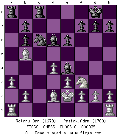 Last move : 1-0 2007 June 12 19:10:29 [Event "FICGS__CHESS__CLASS_C__000035"] [Site "FICGS"] [Date "2007.03.21"] [Round "1"] [White "Rotaru,Dan"] [Black "Pasiak,Adam"] [Result "1-0"] [WhiteElo "1679"] [BlackElo "1700"] 1.d4 d5 2.c4 c6 3.Nf3 Nf6 4.Nc3 Bf5 5.cxd5 cxd5 6.Qb3 Qb6 7.Nxd5 Nxd5 8.Qxd5 e6 9.Qb3 Nc6 10.Bd2 Bd6 11.Qxb6 axb6 12.e3 O-O 13.Bb5 Rfc8 14.Ke2 Be4 15.a3 1-0 This chess game has been lost on time (started : 2007.03.21 2:13:31) QGD Slav : 4.Nc3 Kingside Castling by player Black (move 12) Player White won this chess game. Follow this game move after move (download)You can only get good at Chess if you love the game. (Bobby Fischer) Offener Brief an US-Präsident Bush anlässlich der Verhaftung Bobby Fishers: Verhaften Sie mich. Stecken Sie mich in dieselbe Zelle wie Bobby Fisher und geben Sie uns ein Schachspiel mit. (Boris Vassilievich Spassky) Aún deseo matar a Fischer. (Boris Spassky) Comme les marins qui ont mille raisons différentes d'aller en mer, les joueurs d'échecs en ont tout autant avant de s'installer devant une table et jouer... (Vincent Bertignac, philosophe) I teach you to lie, cheat and steal, and as soon as my back's turned you wait in line ? (Gregory House, House M.D.)