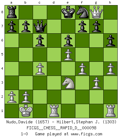 Last move : 1-0 2016 March 13 15:8:50 [Event "FICGS__CHESS__RAPID_D__000098"] [Site "FICGS"] [Date "2016.02.17"] [Round "1"] [White "Nudo,Davide"] [Black "Hilbert,Stephan J."] [Result "1-0"] [WhiteElo "1657"] [BlackElo "1303"] 1.e4 d5 2.exd5 Qxd5 3.Nc3 Qa5 4.d4 Nf6 5.Nf3 Bf5 6.Ne5 c6 7.Nc4 Qc7 8.g3 e6 9.Bf4 Qd8 10.Ne3 Bg6 11.h4 h6 12.Bd3 Bxd3 13.Qxd3 Nbd7 14.O-O-O Nb6 15.Be5 Be7 16.f4 Bd6 17.Kb1 Qc7 18.Ne4 Nxe4 19.Qxe4 Rg8 20.c4 Nd7 21.Qh7 Bxe5 22.Qxg8+ Nf8 23.dxe5 1-0 Scandinavian defense Queenside Castling by player White (move 14) Player White won this chess game. Follow this game move after move (download)It is peculiar but a fact nevertheless, that gamblers in chess always have enthusiastic followers. (Botvinnik) Der Schachmeister von Heute braucht Courage, einen Killerinstinkt, Ausdauer und Arroganz. (Larry Evans) Por esta medida (el intervalo entre Fischer y sus contemporaneos), yo le considero el mas grande campeón mundial. (Garry Kasparov) Nous vivons dans un monde échiquéen : chaque jour qui passe est un défi à relever. (Philosophe Sasha) Good decisions come from experience, and experience comes from bad decisions. (Anonymous)