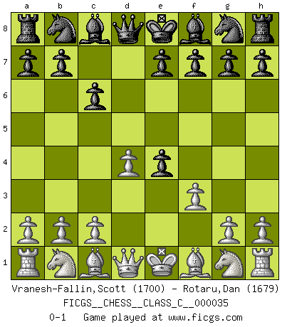 Last move : 0-1 2007 May 1 13:22:0 [Event "FICGS__CHESS__CLASS_C__000035"] [Site "FICGS"] [Date "2007.03.21"] [Round "1"] [White "Vranesh-Fallin,Scott"] [Black "Rotaru,Dan"] [Result "0-1"] [WhiteElo "1700"] [BlackElo "1679"] 1.e4 c6 2.d4 d5 3.f3 dxe4 0-1 This chess game has been lost on time (started : 2007.03.21 2:13:31) Caro-Kann : Tartakower (fantasy) variation Player Black won this chess game. Follow this game move after move (download)He who takes the Queen's Knight's Pawn will sleep in the streets. (Anonymous) Über Kasparov: Es ist offensichtlich, daß er in einem totalitären Staat aufwuchs und deshalb zu diktatorischen Zügen neigt. (Viktor Kortschnoi) El Ajedrez es tan interesante por sí solo, que no es necesario un interés monetario para persuadir a una persona a que lo practique; por lo tanto, nunca se juega por dinero. (Benjamin Franklin) Des combinaisons [dans le jeu d'échecs] pareilles à des mélodies. Je crois entendre pour ainsi dire la musique des coups... (Vladimir Nabokov) There is no vagueness without wind. (Chinese proverb)