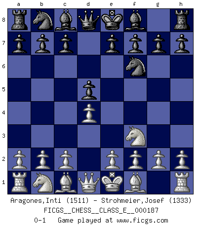 Last move : 0-1 2016 March 30 20:38:8 [Event "FICGS__CHESS__CLASS_E__000187"] [Site "FICGS"] [Date "2016.02.17"] [Round "1"] [White "Aragones,Inti"] [Black "Strohmeier,Josef"] [Result "0-1"] [WhiteElo "1511"] [BlackElo "1333"] 1.d4 d5 2.Nf3 Nf6 0-1 This chess game has been lost on time (started : 2016.02.17 23:15:54) Queen's pawn game Player Black won this chess game. Follow this game move after move (download)Dazzling combinations are for the many, shifting wood is for the few. (Georg Kieninger) Wenn du auf das Glück wartest, wird das Leben ziemlich langweilig. (Mikhail Nekhemyevich Tal) El Ajedrez expande y enriquece tu mente. (Saudin Robovic) Demandez au pauvre Cg1 ce qu'il en pense. Eduard Gufeld à propos de la variante Saemisch de l'Est-Indienne. Winning isn't everything... but losing is nothing. (Mednis)