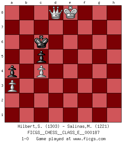 Last move : 1-0 2017 April 12 11:29:38 [Event "FICGS__CHESS__CLASS_E__000187"] [Site "FICGS"] [Date "2016.02.17"] [Round "1"] [White "Hilbert,Stephan J."] [Black "Salinas,Marcelo"] [Result "1-0"] [WhiteElo "1303"] [BlackElo "1221"] 1.Nh3 e5 2.f4 Qh4+ 3.g3 Qh5 4.Nc3 d6 5.Nf2 exf4 6.Bg2 fxg3 7.hxg3 Qg5 8.Nce4 Qg6 9.d3 Bf5 10.Bf4 d5 11.Nc3 Bb4 12.Qd2 d4 13.Bxb7 dxc3 14.bxc3 Qf6 15.Qe3+ Ne7 16.O-O Bxc3 17.Rab1 Bd4 18.Qf3 Bh3 19.Bxa8 Bxf1 20.Rxb8+ Kd7 21.Rxh8 Bxf2+ 22.Kxf2 g5 23.Kxf1 Qxh8 24.Qe4 gxf4 25.gxf4 c6 26.Bb7 Qb8 27.Qd4+ Nd5 28.Ba6 Qxf4+ 29.Qxf4 Nxf4 30.e4 h5 31.Kf2 h4 32.Bc4 f6 33.Bf7 Ke7 34.Bc4 h3 35.Kg3 Kd6 36.d4 c5 37.d5 Ke5 38.Bf1 Kxe4 39.d6 Ne6 40.Bxh3 f5 41.c4 Ke5 42.d7 f4+ 43.Kf2 Nd8 44.Kf3 a5 45.a3 Nf7 46.Bg4 Ng5+ 47.Ke2 Nf7 48.Kd3 Kd6 49.Ke4 f3 50.Kxf3 Kc7 51.Ke4 Kd6 52.Kf4 Kc7 53.Be6 Nd8 54.Ke5 a4 55.Kf6 Kd6 56.Bh3 Nc6 57.Kf7 Ne5+ 58.Ke8 Nc6 59.Bg2 Kc7 60.Bxc6 Kxc6 61.d8Q 1-0 This chess game has been lost on time (started : 2016.02.17 23:15:54) Amar (Paris) Opening Kingside Castling by player White (move 16) 10 pieces endgame at move 40 : White KBPPP , Black KNPPP WHITE : King + 1 Bishop 3 Pawns BLACK : King + 1 Knight 3 Pawns 9 pieces endgame at move 50 : White KBPPP , Black KNPP WHITE : King + 1 Bishop 3 Pawns BLACK : King + 1 Knight 2 Pawns 8 pieces endgame at move 60 : White KBPPP , Black KPP WHITE : King + 1 Bishop 3 Pawns BLACK : King + 2 Pawns 7 pieces endgame at move 60 : White KPPP , Black KPP WHITE : King + 3 Pawns BLACK : King + 2 Pawns Promotion Queen by player White (move 61) Player White won this chess game. Follow this game move after move (download)Play the opening like a book, the middle game like a magician, and the endgame like a machine. (Spielmann) Schach ist ein schwarz-weisser Dschungel. (Garry Kasparov) Tu cuerpo tiene que estar en óptima condición. Tu Ajedrez se deteriora como lo hace tu cuerpo. No puedes separar la mente y el cuerpo. (Bobby Fischer) RxDa4 pat (...) There are two types of people in this world, good and bad. The good sleep better, but the bad seem to enjoy the waking hours much more. (Woody Allen)