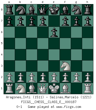Last move : 0-1 2016 April 2 8:45:34 [Event "FICGS__CHESS__CLASS_E__000187"] [Site "FICGS"] [Date "2016.02.17"] [Round "1"] [White "Aragones,Inti"] [Black "Salinas,Marcelo"] [Result "0-1"] [WhiteElo "1511"] [BlackElo "1221"] 1.Nf3 e6 0-1 This chess game has been lost on time (started : 2016.02.17 23:15:54) Reti Opening Player Black won this chess game. Follow this game move after move (download)In Chess, just as in life, today's bliss may be tomorrow's poison. (Assaic) Verschiedene, sehr schätzbare und im Laufe des Lebens nützliche Eigenschaften des Geistes können durch das Schachspiel erworben und gekräftigt werden, so dass sie zu Gewohnheiten werden, die uns nie im Stich lassen. (Benjamin Franklin) Me dio la sensación de como si yo estuviera jugando en contra del mismo Ajedrez. - al estar jugando en contra de Robert Fischer (Walter Shipman) Même un GMI sait rarement calculer sur plus de cinq coups une attaque à sacrifices. (Rudolf Spielmann) Wipe them out. All of them. (Darth Sidious in Star Wars ep.1)