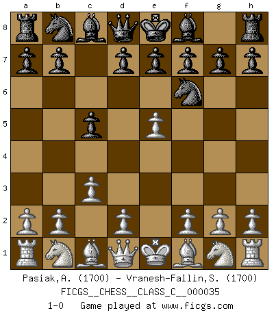 Last move : 1-0 2007 May 2 1:26:51 [Event "FICGS__CHESS__CLASS_C__000035"] [Site "FICGS"] [Date "2007.03.21"] [Round "1"] [White "Pasiak,Adam"] [Black "Vranesh-Fallin,Scott"] [Result "1-0"] [WhiteElo "1700"] [BlackElo "1700"] 1.e4 c5 2.c3 Nf6 3.e5 1-0 This chess game has been lost on time (started : 2007.03.21 2:13:31) Sicilian : Alapin's variation (2.c3) Player White won this chess game. Follow this game move after move (download)Chess teaches you to control the initial excitement you feel when you see something that looks good and it trains you to think objectively when you're in trouble. (Stanley Kubrick) Capablanka war das größte Genie der Schachgeschichte! Aber denken sie nicht er habe nichts vom Schach verstanden. Er wusste nur soviel wie er wissen musste um seine Ziele zu erreichen. (Mikhail Moiseyevich Botvinik) Yo he agregado estos principios a la ley: pongan los Caballos en acción antes de que los dos Alfiles sean desarrollados. (Emanuel Lasker) Aidez vos pièces, elles vous aideront. (Paul Morphy) If you are going through hell, keep going. (Winston Churchill)