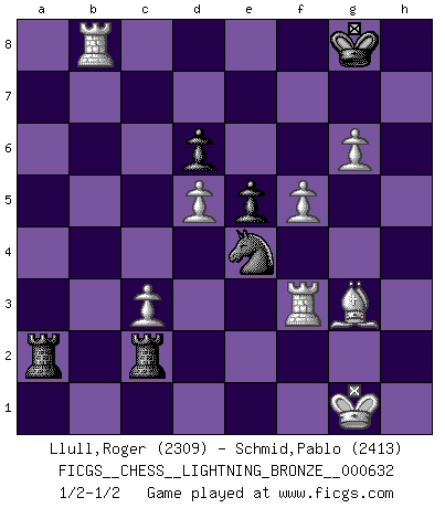 Last move : 1/2-1/2 2016 February 20 23:36:5 [Event "FICGS__CHESS__LIGHTNING_BRONZE__000632"] [Site "FICGS"] [Date "2016.02.20"] [Round "1"] [White "Llull,Roger"] [Black "Schmid,Pablo"] [Result "1/2-1/2"] [WhiteElo "2309"] [BlackElo "2413"] 1.e4 c5 2.Nc3 d6 3.Nge2 Nf6 4.d4 cxd4 5.Nxd4 g6 6.f3 Bg7 7.Be3 O-O 8.Qd2 Nc6 9.g4 Be6 10.Nxe6 fxe6 11.O-O-O Ne5 12.Be2 Qc8 13.h4 Nfd7 14.h5 Nc4 15.Bxc4 Qxc4 16.hxg6 hxg6 17.f4 Bxc3 18.bxc3 Qxa2 19.Qd3 e5 20.f5 Rac8 21.Rh6 Nf6 22.Rxg6+ Kf7 23.g5 Ng4 24.Bg1 Rfd8 25.Qg3 Rc4 26.Qh3 Rh8 27.Qd3 Qa3+ 28.Kd2 Rc7 29.Rf1 Qa5 30.Rf3 Rhc8 31.Qd5+ Qxd5+ 32.exd5 Rh8 33.Rg3 Rc4 34.Bxa7 b5 35.Re6 Rh5 36.g6+ Kg8 37.Rxe7 Nf6 38.Rf3 Rh2+ 39.Ke1 Rxc2 40.Bf2 Re4+ 41.Kf1 R4e2 42.Rb7 Re4 43.Rxb5 Ra4 44.Rb1 Ra8 45.Kg1 R8a2 46.Bg3 Ne4 47.Rb8+ Kg7 48.Rb7+ Kg8 49.Rb8+ Kg7 50.Rb7+ Kg8 51.Rb8+ 1/2-1/2 Sicilian : Closed Kingside Castling by player Black (move 7) Queenside Castling by player White (move 11) This chess game ended in a draw. Follow this game move after move (download)The most powerful weapon in Chess is to have the next move. (David Bronstein) Schach ist ein Teil der Kultur, und wenn es mit der Kultur abwärts geht, geht es auch mit dem Schach abwärts. (Mikhail Moiseyevich Botvinik) Si el Ajedrez es una ciencia, es la mas inexacta. Si el Ajedrez es un arte, es demasiado inexacto para ser visto como tal. Si el Ajedrez es un deporte, es demasiado esotérico. Si el Ajedrez es un juego, es demasiado exigente para ser solo un juego. Si el Ajedrez es una aventura, es una muy demandante. Si el Ajedrez es una pasión, es una muy gratificante. Si el Ajedrez es la vida, es una muy triste. (Anónimo) Vous m'avez demandé de vous exposer quel est le fondement de la prière. Je ne fais que préparer les pièces du jeu sur la table... Nous sera-t-il permis d'en adopter les règles et si nous les appliquons scrupuleusement nous ne tarderons pas à faire mat le Roi divin ! Il ne pourra échapper à nos mains. (Sainte Thérèse d'Avila, Chemin de perfection) Now you put water in a cup, it becomes the cup; You put water into a bottle it becomes the bottle; You put it in a teapot it becomes the teapot. Water can flow or it can crash. Be water, my friend. (Bruce Lee)