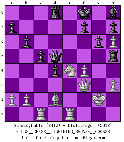 Last move : 1-0 2016 February 21 0:47:52 [Event "FICGS__CHESS__LIGHTNING_BRONZE__000633"] [Site "FICGS"] [Date "2016.02.20"] [Round "1"] [White "Schmid,Pablo"] [Black "Llull,Roger"] [Result "1-0"] [WhiteElo "2410"] [BlackElo "2312"] 1.d4 Nf6 2.c4 e6 3.Nf3 b6 4.g3 Ba6 5.Qc2 c5 6.d5 exd5 7.cxd5 Bb7 8.Bg2 Nxd5 9.O-O Be7 10.Rd1 Nc6 11.Qf5 Nf6 12.e4 g6 13.Qf4 Nh5 14.Qh6 Bf8 15.Qe3 Bg7 16.e5 O-O 17.g4 Re8 18.gxh5 Nxe5 19.Nxe5 Bxg2 20.Kxg2 Rxe5 21.Qf3 d5 22.Nc3 d4 23.h6 Rf5 24.Qg4 Be5 25.f4 Bh8 26.Qf3 Rh5 27.Ne4 Qd5 28.Bd2 Re8 29.Re1 Kf8 30.Rac1 Rd8 31.h3 1-0 Queen's Indian : Nimzovich variation (exaggerated Fianchetto) Kingside Castling by player White (move 9) Kingside Castling by player Black (move 16) Player White won this chess game. Follow this game move after move (download)Chess is played with the mind and not with the hands ! (Renaud and Kahn) Wer mein Gambit spielt, muß bereit sein, alle Brücken hinter sich abzubrechen. Es verändert den ganzen Menschen. Es wirkt wie ein Zauberstab und fördert verkümmerte, gute Charakter- eigenschaften wieder zu Tage. (Emil Joseph Diemer) Yo siempre he tenido un ligero sentimiento de lástima por una persona que no tiene conocimiento del Ajedrez. (Siegbert Tarrasch) Des points faibles ou des trous dans la position de l'adversaire doivent être occupés par des pièces et non pas par des pions. (Siegbert Tarrasch) Work expands to fill the time available. (C. Northcote Parkinson, in Parkinson's Laws)