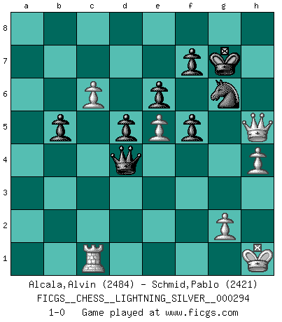 Last move : 1-0 2016 February 21 19:53:49 [Event "FICGS__CHESS__LIGHTNING_SILVER__000294"] [Site "FICGS"] [Date "2016.02.21"] [Round "1"] [White "Alcala,Alvin"] [Black "Schmid,Pablo"] [Result "1-0"] [WhiteElo "2484"] [BlackElo "2421"] 1.d4 e6 2.e4 d5 3.Nc3 Nf6 4.e5 Nfd7 5.f4 c5 6.Nf3 Nc6 7.Be3 a6 8.Qd2 Qb6 9.Rb1 Qa7 10.Ne2 Be7 11.c3 b6 12.Ng3 g6 13.Be2 a5 14.O-O Ba6 15.h4 h5 16.Rfd1 a4 17.b4 axb3 18.axb3 Bxe2 19.Nxe2 Qb7 20.f5 gxf5 21.Bg5 Rg8 22.Nf4 b5 23.b4 cxb4 24.cxb4 Rh8 25.Bxe7 Nxe7 26.Ra1 Rb8 27.Nd3 Ra8 28.Rxa8+ Qxa8 29.Rc1 Rg8 30.Ng5 Qa7 31.Qc3 Qb6 32.Nc5 Nxc5 33.bxc5 Qc7 34.Nh7 Rh8 35.Nf6+ Kf8 36.c6 Kg7 37.Qg3+ Ng6 38.Qg5 Qa7 39.Nxh5+ Rxh5 40.Qxh5 Qxd4+ 41.Kh1 1-0 Queen's pawn Kingside Castling by player White (move 14) Player White won this chess game. Follow this game move after move (download)The game of Chess is not merely an idle amusement; several very valuable qualities of the mind are to be acquired and strengthened by it, so as to become habits ready on all occasions; for life is a kind of Chess. (Benjamin Franklin) Ich habe Kasparov in Rente geschickt. (Veselin Topalov) El Ajedrez por encima de todo... ¡es una pelea!. (Emanuel Lasker) Je ne crois pas en la psychologie, je crois aux bons coups. (Robert Fischer) No, I am still playing. (Anatoly Karpov)