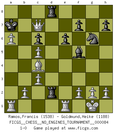 Last move : 1-0 2016 March 15 23:9:24 [Event "FICGS__CHESS__NO_ENGINES_TOURNAMENT__000084"] [Site "FICGS"] [Date "2016.02.21"] [Round "1"] [White "Ramos,Francis"] [Black "Goldmund,Heike"] [Result "1-0"] [WhiteElo "1538"] [BlackElo "1188"] 1.e4 d5 2.exd5 Qxd5 3.Nc3 Qa5 4.d4 Nf6 5.Nf3 Bf5 6.Ne5 e6 7.Bc4 c6 8.O-O Qc7 9.Re1 Nbd7 10.Bf4 Bd6 11.Bg3 Nb6 12.Bb3 O-O-O 13.a4 Nbd5 14.a5 a6 15.Na4 Kb8 16.Qe2 Rhe8 17.Nc5 Nb4 18.c3 Nbd5 19.Bc4 g5 20.Bxa6 Bxc5 21.dxc5 Re7 22.Nxc6+ bxc6 23.Bxc7+ Kxc7 24.Bc4 Nf4 25.Qe5+ Kb7 26.Qxf6 Red7 27.Qxg5 Ng6 28.Qg3 Rd2 29.a6+ Ka7 30.Qc7+ 1-0 Scandinavian defense Kingside Castling by player White (move 8) Queenside Castling by player Black (move 12) Player White won this chess game. Follow this game move after move (download)If your opponent offers you a draw, try to work out why he thinks he's worse off. (Nigel Short) Wie, soll nun auch die Opposition abgeschafft werden? Ja, es tut mir leid, Ihnen diesen Schmerz nicht ersparen zu können. (Aaron Nimzowitsch) El Ajedrez es un cuento de Hadas de las 1001 metidas de pata. (Savielly Tartakower) Nous sommes les pions de la mystérieuse partie d'Echecs jouée par Dieu. Il nous déplace, nous arrête, nous pousse encore, puis nous lance un à un dans la boîte du Néant. Epitaphe sur la tombe de David Janowsky (1868-1927). Computers make it easier to do a lot of things, but most of the things they make it easier to do don't need to be done. (Andy Rooney)