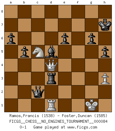 Last move : 0-1 2016 April 2 17:2:54 [Event "FICGS__CHESS__NO_ENGINES_TOURNAMENT__000084"] [Site "FICGS"] [Date "2016.02.21"] [Round "1"] [White "Ramos,Francis"] [Black "Foster,Duncan"] [Result "0-1"] [WhiteElo "1538"] [BlackElo "1585"] 1.e4 b6 2.Nf3 Bb7 3.Nc3 e6 4.d4 a6 5.Bd3 h6 6.Bf4 d6 7.O-O g6 8.Qe2 Bg7 9.Rad1 Ne7 10.h3 Nd7 11.a4 O-O 12.Qd2 Kh7 13.Rfe1 c5 14.Be3 d5 15.exd5 Nxd5 16.dxc5 Nxe3 17.Rxe3 Nxc5 18.Qe2 Qe7 19.Nh2 Bxc3 20.bxc3 Nxa4 21.Ng4 Nxc3 22.Bxg6+ fxg6 23.Rxc3 b5 24.Re3 Rae8 25.Red3 Bd5 26.Qe3 Qg7 27.Ne5 Rf5 28.Ng4 Ref8 29.f3 h5 30.Nf2 Qc7 31.Ne4 Qxc2 32.Nc5 Rxf3 33.gxf3 Rxf3 34.Qd4 Rxd3 0-1 Owen defense Kingside Castling by player White (move 7) Kingside Castling by player Black (move 11) Player Black won this chess game. Follow this game move after move (download)The only thing Chess players have in common is Chess. (Lodewijk Prins) Frage: Wie viele Autos haben Sie schon zerstört? - Antwort: Nur zwei. (Loek van Wely) Un entendimiento minucioso de las típicas continuaciones de mate hacen de las mas complicadas combinaciones de sacrificio que conducen hacia ellas no solo no dificiles, sino casi un asunto de rutina. (Siegbert Tarrasch) Soyez une menace à chaque fois que vous vous asseyez pour jouer. (Ken Smith) Every man's memory is his private literature. (Aldous Huxley)