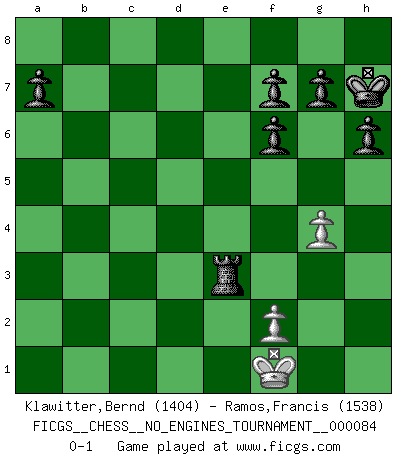 Last move : 0-1 2016 August 11 19:21:27 [Event "FICGS__CHESS__NO_ENGINES_TOURNAMENT__000084"] [Site "FICGS"] [Date "2016.02.21"] [Round "1"] [White "Klawitter,Bernd"] [Black "Ramos,Francis"] [Result "0-1"] [WhiteElo "1404"] [BlackElo "1538"] 1.e4 c5 2.c3 d5 3.exd5 Qxd5 4.d4 cxd4 5.cxd4 Nc6 6.Ne2 Bg4 7.Nbc3 Qa5 8.h3 Bh5 9.g4 Bg6 10.Bd2 Qb6 11.Nd5 Qd8 12.Bg2 h6 13.O-O Nf6 14.Nxf6+ exf6 15.Bxc6+ bxc6 16.Bc3 Bd6 17.Qa4 Qc7 18.Rae1 O-O 19.d5 cxd5 20.Nc1 Be4 21.Rxe4 dxe4 22.Qxe4 Rae8 23.Qg2 Re6 24.Nb3 Rfe8 25.Nd4 R6e7 26.Nf5 Re2 27.Nxd6 Qxd6 28.Qf3 R8e3 29.Qa8+ Kh7 30.Qg2 Rd3 31.a3 Qf4 32.Be1 Rxb2 33.Qh2 Qxh2+ 34.Kxh2 Rxa3 35.Kg2 Rb1 36.Bd2 Rxf1 37.Kxf1 Rxh3 38.Be3 Rxe3 0-1 Sicilian : Alapin's variation (2.c3) Kingside Castling by player White (move 13) Kingside Castling by player Black (move 18) 10 pieces endgame at move 38 : White KPP , Black KRPPPPP WHITE : King + 2 Pawns BLACK : King + 1 Rook 5 Pawns Player Black won this chess game. Follow this game move after move (download)I have added these principles to the law: get the Knights into action before both Bishops are developed. (Emanuel Lasker) Schach ist eine Sache der genauen Beurteilung, wann man zuschlagen und wann man sich ducken muss. (Robert James Fischer) Robert Fischer es la ley hacia si mismo. (Larry Evans) Echiquier : carré parfait, comme la Jérusalem nouvelle décrite par l'auteur de l'Apocalypse, huit cases sur huit, exaltation du chiffre 4, symbole du cosmos aux quatre horizons... où le noir et le blanc, l'ombre et la lumière, le mal et le bien s'entremêlent et se conjuguent. (Robert Couffignal, Le Gambit du poète) Yoga is 99% practice and 1% knowledge. (Sri Krishna Pattabhi Jois)