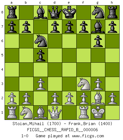 Last move : 1-0 2006 July 6 0:57:30 [Event "FICGS__CHESS__RAPID_B__000006"] [Site "FICGS"] [Date "2006.05.31"] [Round "1"] [White "Stoian,Mihail"] [Black "Frank,Brian"] [Result "1-0"] [WhiteElo "1700"] [BlackElo "1400"] 1.Nf3 c5 2.g3 Nc6 3.Bg2 g6 4.O-O Bg7 5.c3 1-0 This chess game has been lost on time (started : 2006.05.31 4:5:48) Reti Opening Kingside Castling by player White (move 4) Player White won this chess game. Follow this game move after move (download)As one by one I mowed them down, my superiority soon became apparent. (Jose Capablanca) Es gibt Leute, die glauben, alles wäre vernünftig, was man mit einem ernsthaften Gesicht tut. (Georg Christoph Lichtenberg) ¿Quién es tu oponente esta tarde? Esta tarde mi oponente son las piezas negras. (Akiba Rubinstein) Même un GMI sait rarement calculer sur plus de cinq coups une attaque à sacrifices. (Rudolf Spielmann) You lose, general Kenobi. (General Grievous in Star Wars ep.3)