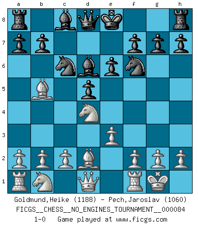 Last move : 1-0 2016 June 17 23:4:31 [Event "FICGS__CHESS__NO_ENGINES_TOURNAMENT__000084"] [Site "FICGS"] [Date "2016.02.21"] [Round "1"] [White "Goldmund,Heike"] [Black "Pech,Jaroslav"] [Result "1-0"] [WhiteElo "1188"] [BlackElo "1060"] 1.Nf3 d5 2.d4 Nf6 3.e3 e6 4.Bd3 c5 5.O-O Nc6 6.Bb5 Bd6 7.Bd2 cxd4 8.Nxd4 1-0 This chess game has been lost on time (started : 2016.02.21 22:57:44) Reti Opening Kingside Castling by player White (move 5) Player White won this chess game. Follow this game move after move (download)Whoever sees no other aim in the game than that of giving checkmate to one's opponent will never become a good Chess player. (Euwe) Ich war schon mal beim Dopingtest. Da musste ich Urin abgeben, während Dritte zusahen. (Elisabeth Pähtz) El Ajedrez detiene a su maestro dentro de sus propios vínculos, encadenando la mente y el cerebro, por lo que la libertad interior del mas fuerte debe sufrir. (Albert Einstein) Il s'avisa de me proposer d'apprendre les échecs qu'il jouait un peu... me voilà forcené des échecs. J'achète un échiquier, je m'enferme dans ma chambre, j'y passe des jours et des nuits à vouloir apprendre par cur toutes les parties. (Jean-Jacques Rousseau, Confessions) Whoever said the pen is mightier than the sword obviously never encountered automatic weapons. (US General Douglas MacArthur)