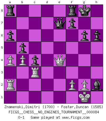Last move : 0-1 2016 March 11 4:20:4 [Event "FICGS__CHESS__NO_ENGINES_TOURNAMENT__000084"] [Site "FICGS"] [Date "2016.02.21"] [Round "1"] [White "Znamenski,Dimitri"] [Black "Foster,Duncan"] [Result "0-1"] [WhiteElo "1700"] [BlackElo "1585"] 1.e4 b6 2.d4 Bb7 3.Nc3 e6 4.Nf3 h6 5.Be2 a6 6.O-O g6 7.a3 Bg7 8.e5 Ne7 9.Ne4 Bxe4 10.Bd3 Bb7 11.Re1 O-O 12.c4 d5 13.cxd5 Bxd5 14.Be4 Bxe4 15.Rxe4 Nbc6 16.Re2 Nf5 17.Be3 Nxe3 18.Rxe3 Qe7 19.Rc3 Nd8 20.d5 exd5 21.Qxd5 Ne6 22.Rac1 c5 23.Qc6 b5 24.b4 c4 25.Ra1 Nf4 26.Qe4 Nd3 27.a4 Nxe5 28.Nxe5 Bxe5 29.Ra2 Bxh2+ 0-1 Owen defense Kingside Castling by player White (move 6) Kingside Castling by player Black (move 11) Player Black won this chess game. Follow this game move after move (download)Avoid the crowd. Do your own thinking independently. Be the Chess player, not the Chess piece. (Ralph Charell) Ein guter Spieler hat immer Glück. (José Raúl Capablanca) Cuando le juegas a Fischer, no es una cuestion de si vas a ganar o perder. Es una cuestion de si vas a sobrevivir. (Boris Spassky) Les échecs c'est le défi de l'alpiniste, toujours plus haut, prêt à tout pour monter à l'assaut du Roi ennemi. Les échecs, c'est de la musique en mouvement, un ballet majestueux pour les yeux. C'est de la poésie composée par les fantômes du passé qui au même titre que Rimbaud ou Verlaine méritent notre admiration. Les échecs, c'est de la peinture ou le moindre mouvement modifie le tableau pour en faire un Picasso ou un Van Gogh. Les échecs, c'est tout et rien, c'est la vie et la mort. Jjulie33 sur le forum de France-Echecs. The problem with troubleshooting is that trouble shoots back. (Anonymous)